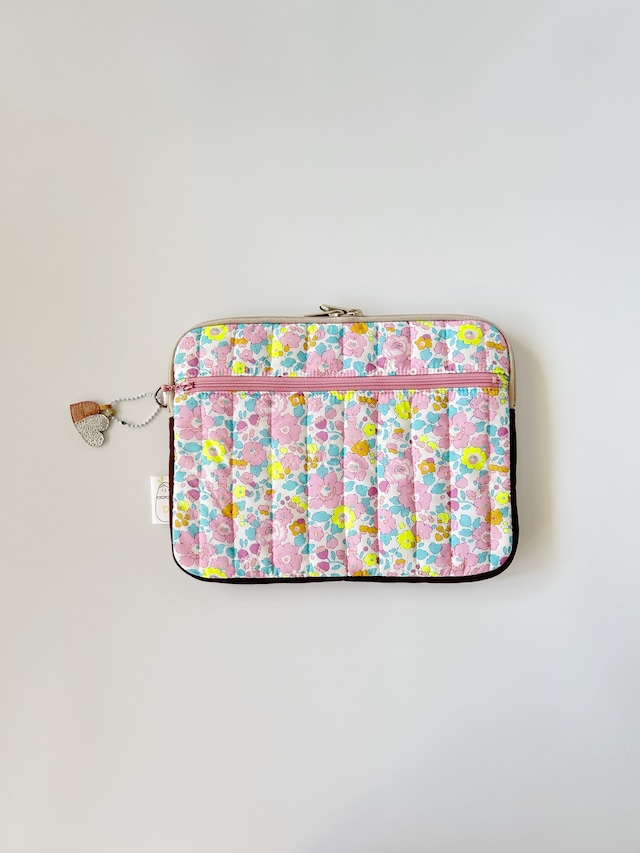 size 20.8×27.4x1.8cm 新作のタブレットケースです。 表は リバティのBetsyです。 キルティング加工してます。 前側にファスナーポケットが付いていて、大きめなので充電器やコードなど小物をを入れることができます。 ドミット芯の他にクッション材を挟んでるので、とてもしっかりした作りになってます。 内側は、ピンク色x白色のチェック柄のガーゼ生地でふかふかです。 2つに分かれたポケット付きです。 細い方にペン類を、広い方にメモ帳などを入れるのもおすすめです。 サイドのDカンにハートのチャームが付いてます(ポールチェーンで取り外し可能)。 ファスナー両開きタイプの40cmです。 ぱかっと開けやすく荷物の出し入れがしやすいです。 マチは、茶色の帆布にドミット芯を挟んでます。 会社のタブレットを入れたり、 学生さんは、タブレットの他に小さめの教科書なども入ります。 スクールバッグにもすっぽりとおさまります。 人と違うかわいいタブレットケースで、勉強やお仕事を楽しく♡ 同じ生地でpcケースも作りました。 お揃いで持ってもかわいいです。 撮影ではiPad(24.3x16.7)(11インチ)を使用しています。 ご自身のタブレットサイズをご確認くださいませ。 撮影小物は非売品です。 最後の写真数枚は、別売り商品です。 ポールチェーンの接触部分が少し禿げやすくなっています。