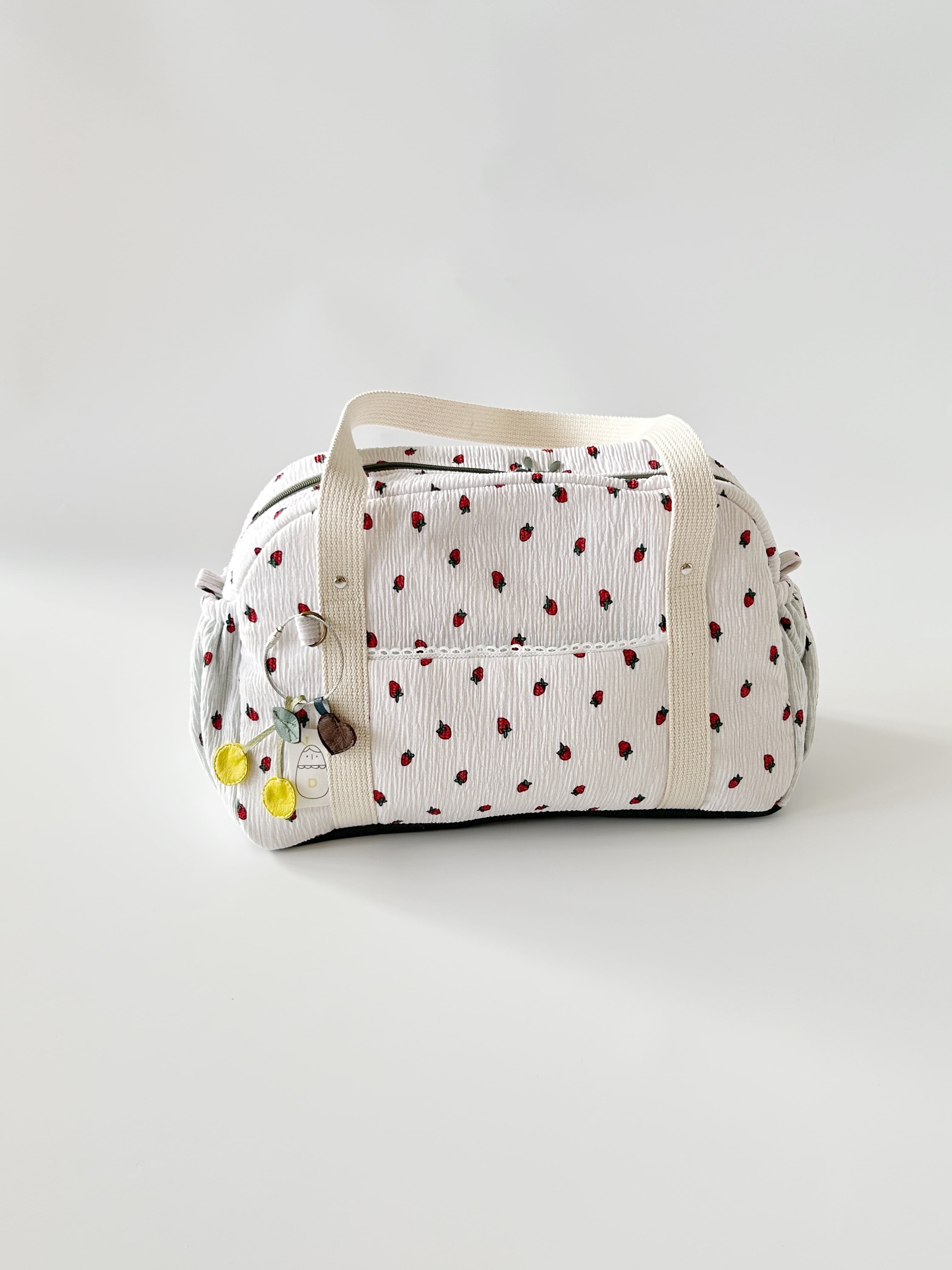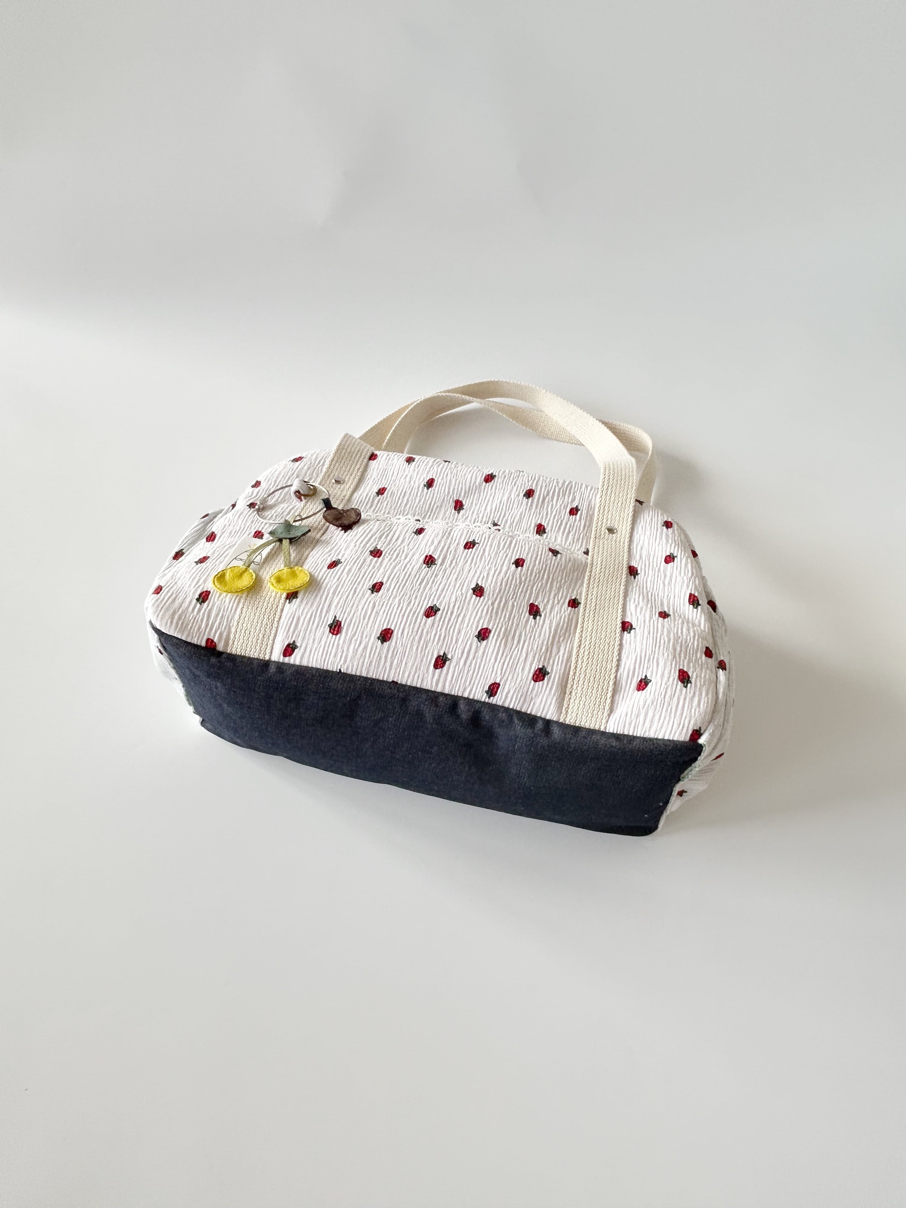 ポケット横にはかわいいオリジナルタブとさくらんぼとハートのチャームが付いてます。