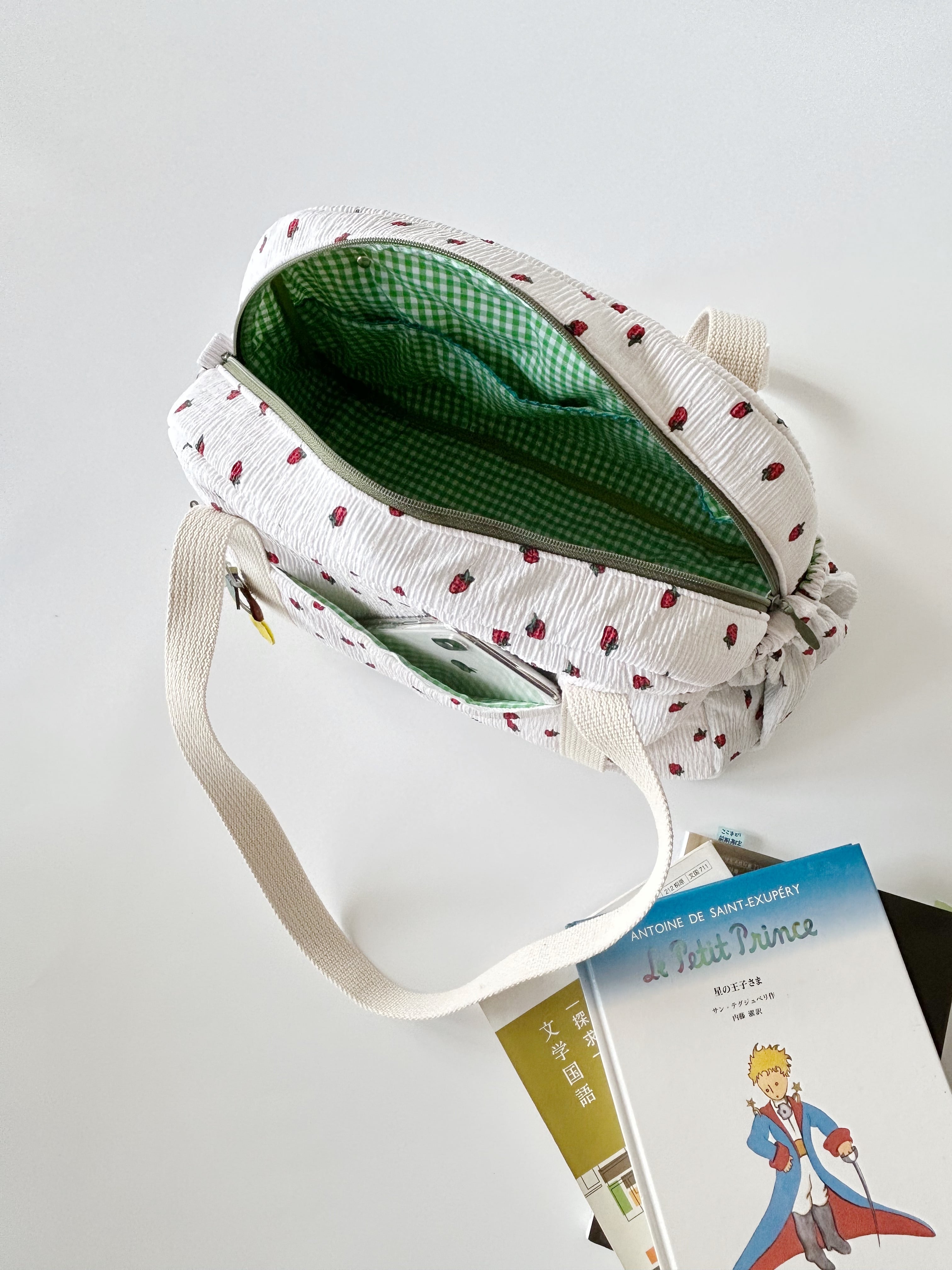 内袋は、緑色x白色のギンガムチェックです。