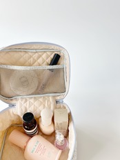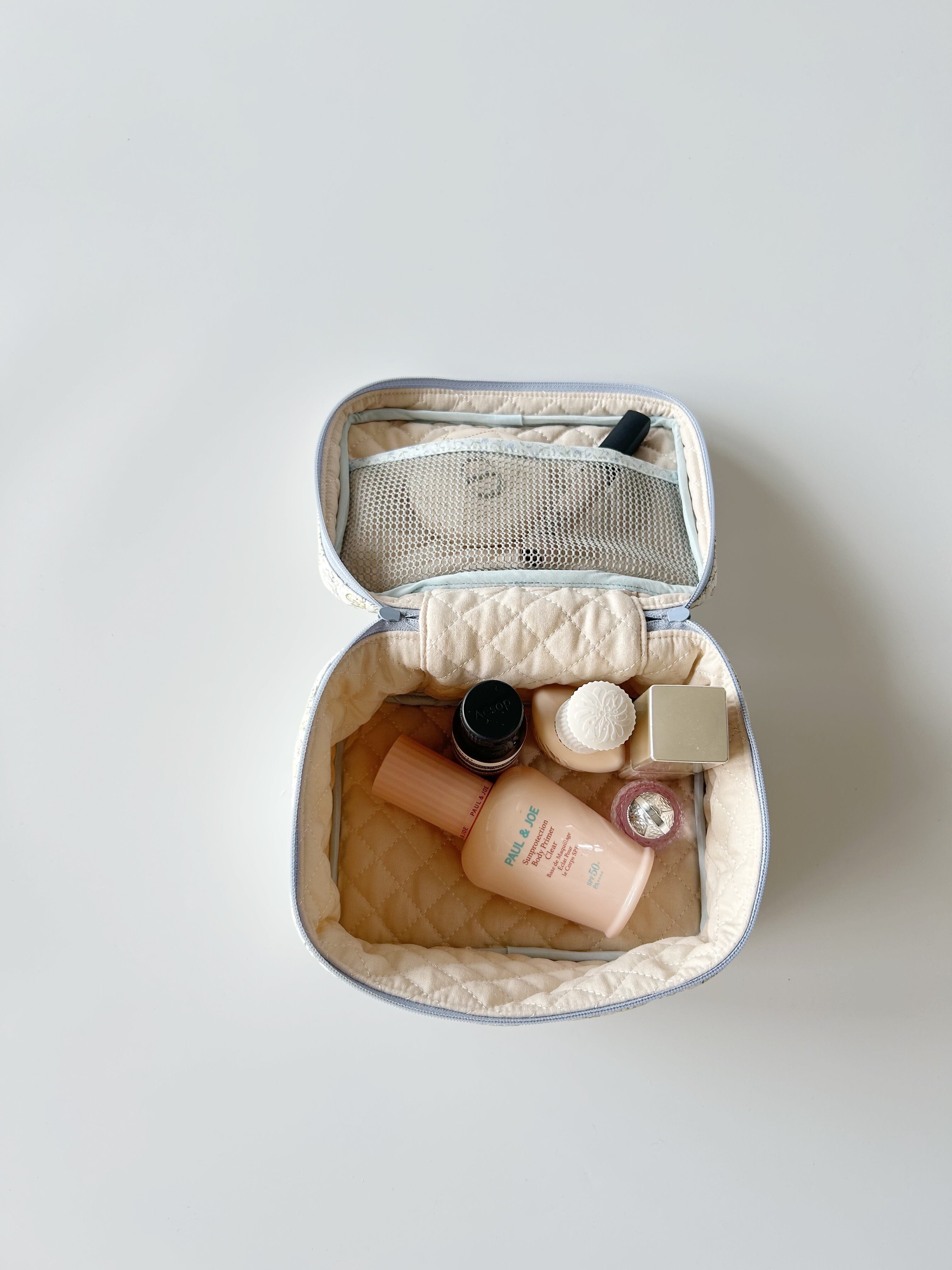 大きく開く設計により、物の出し入れが容易です。化粧品や小物、旅行中に必要なアイテムをたっぷり収納できます。