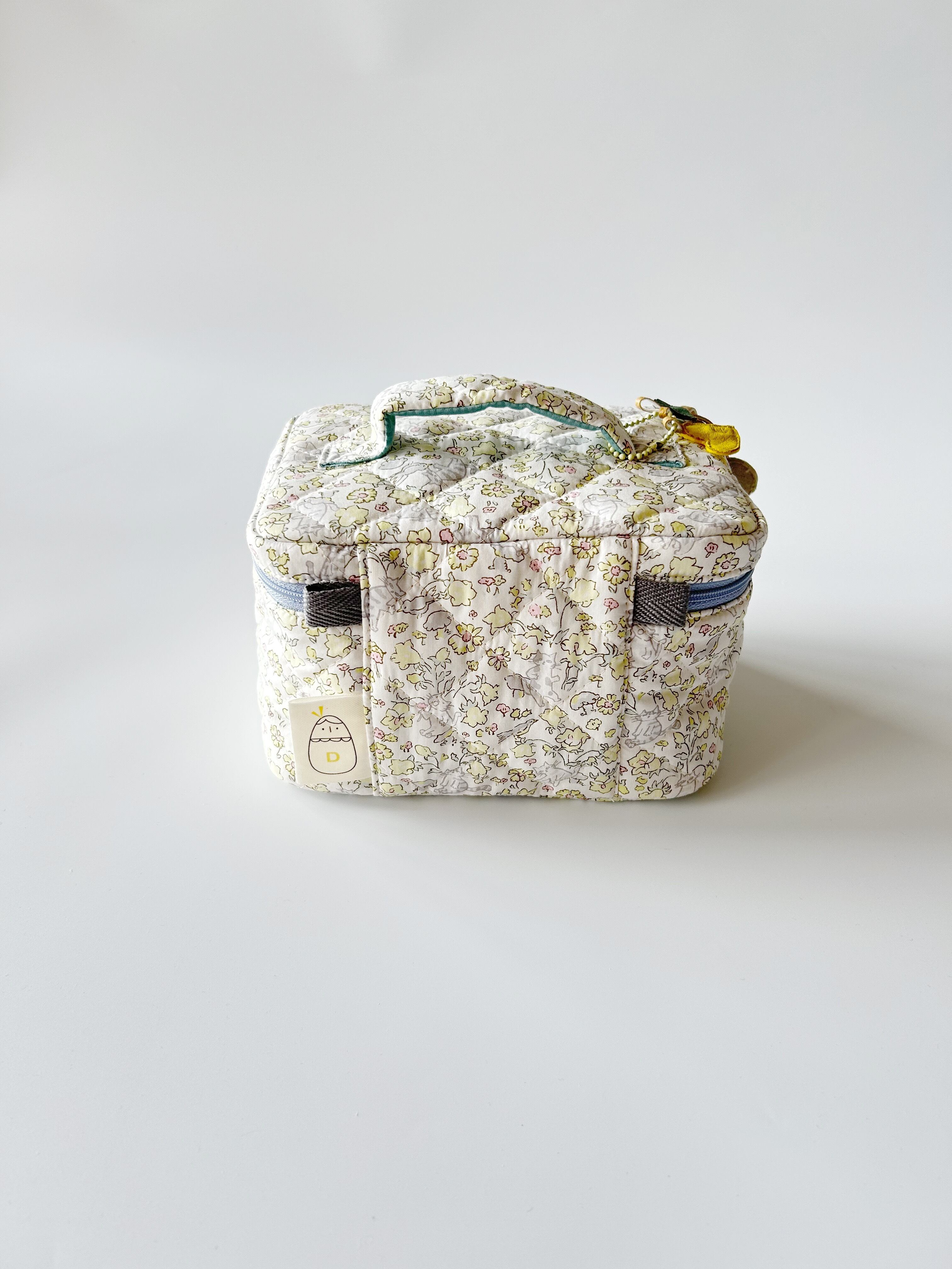 ファスナーやバイアステープや内ポケットなど、落ち着いた水色やグレー色でまとめてます。