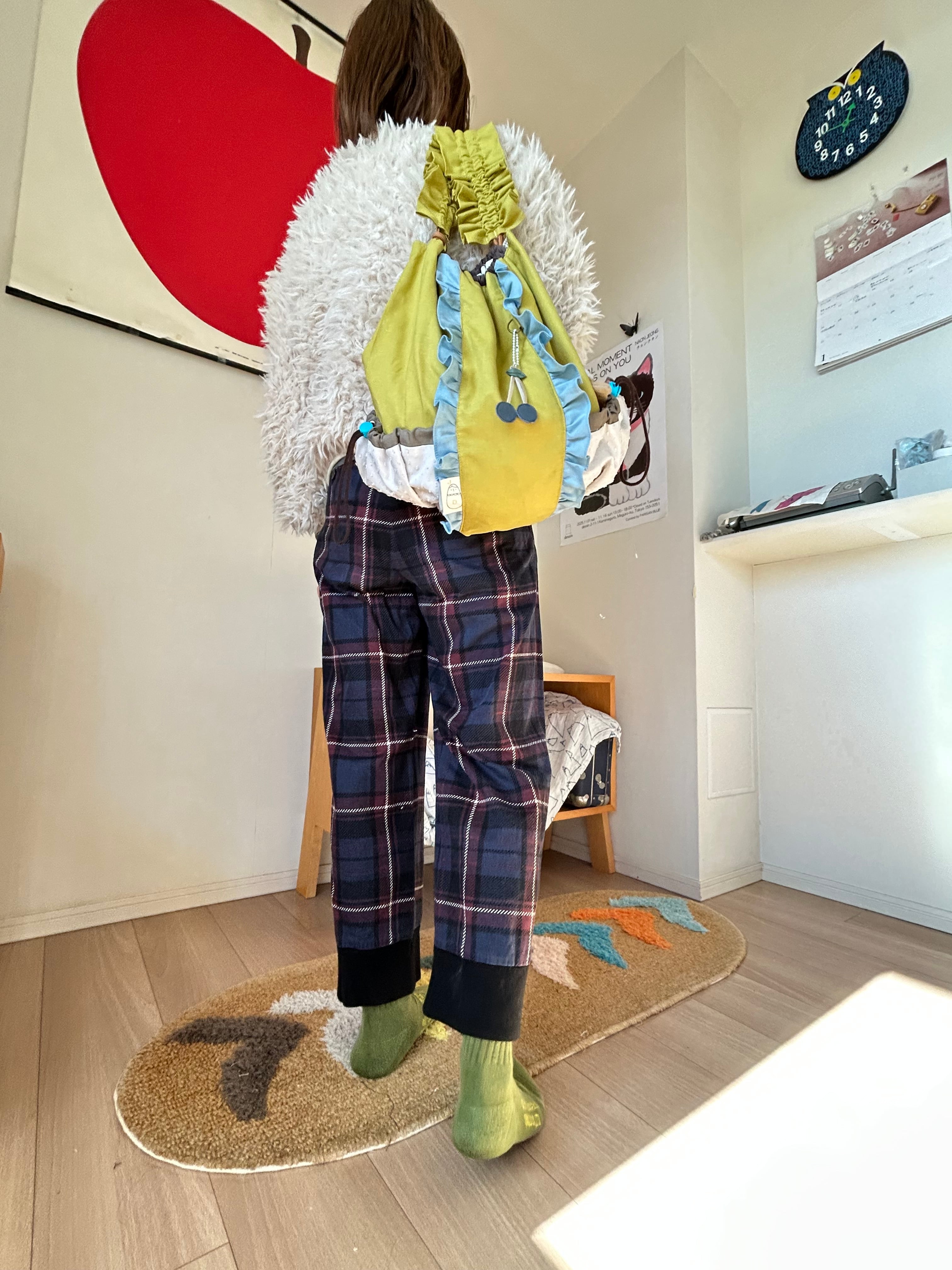 両サイドは大きなポケット(c&sのドットミニヨン)が付いていて(背中の方までぐるりと)、ギューっと絞るとコロンとしたシルエットに変身