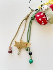 パラコードのチャームが2つ、お花や流れ星の飾りが付いていて、丸型やハート型のストッパーもジャラジャラと賑やかです。