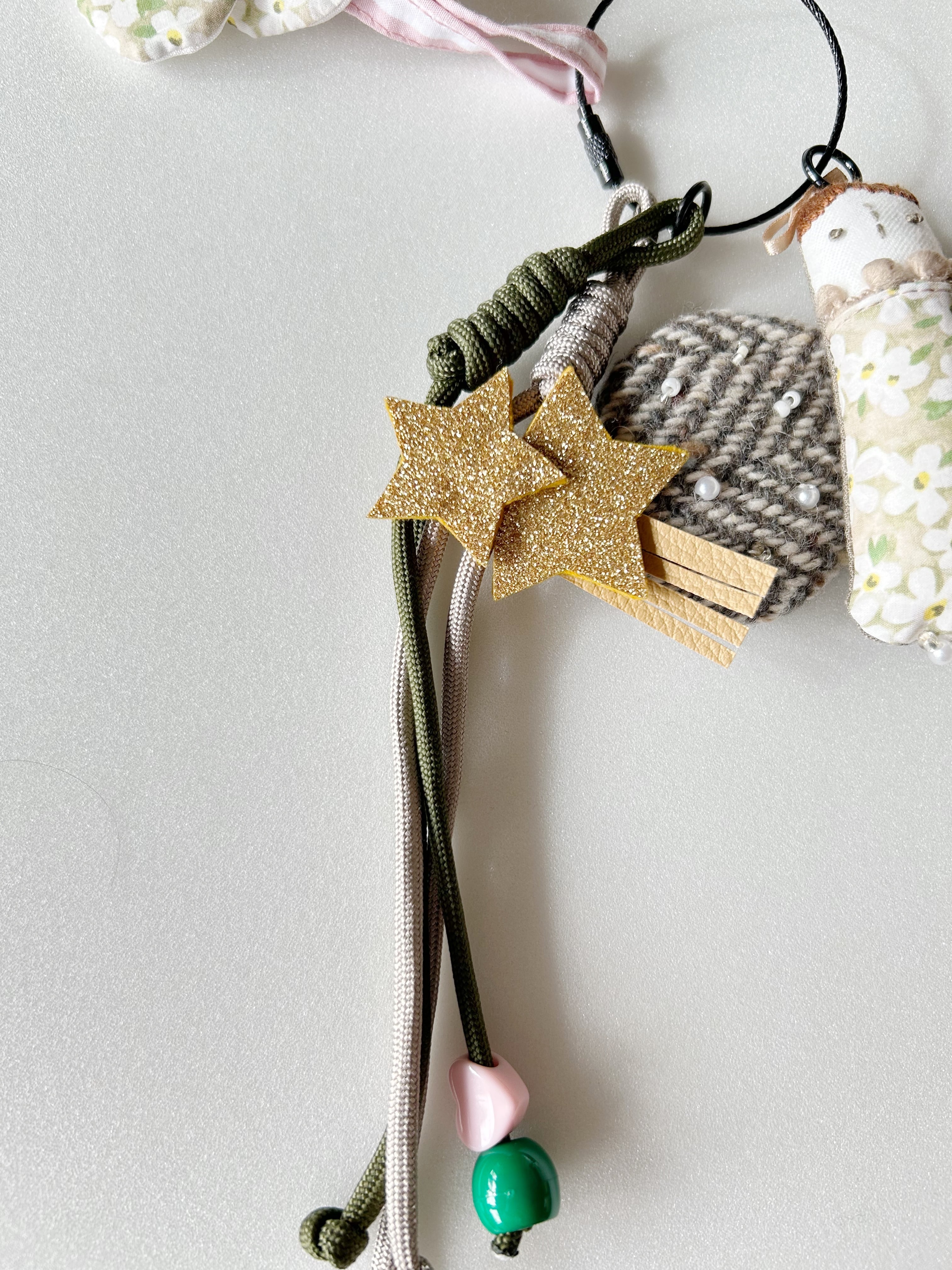 パラコードのチャームが2つ、お花や流れ星の飾りが付いていて、丸型やハート型のストッパーもジャラジャラと賑やかです。