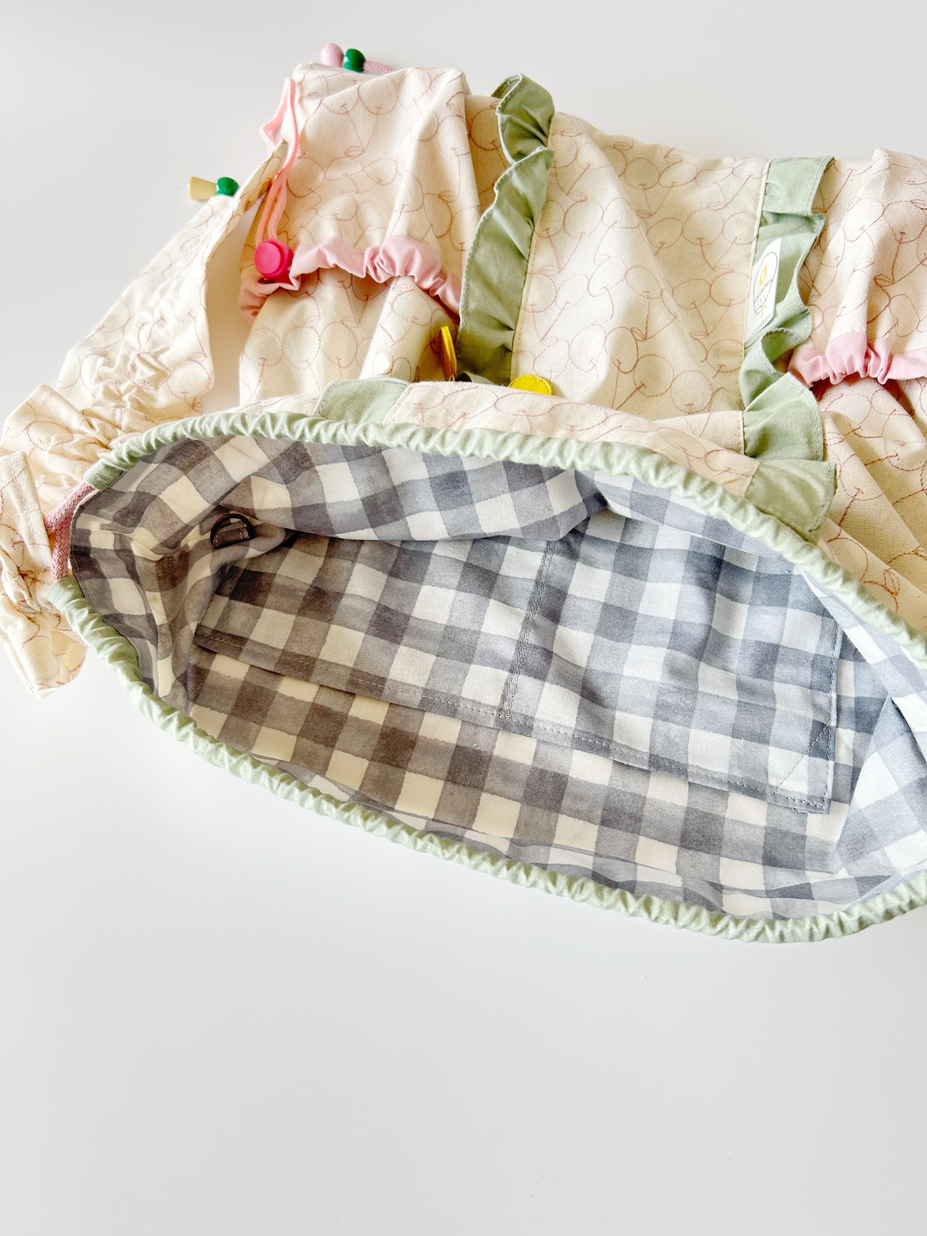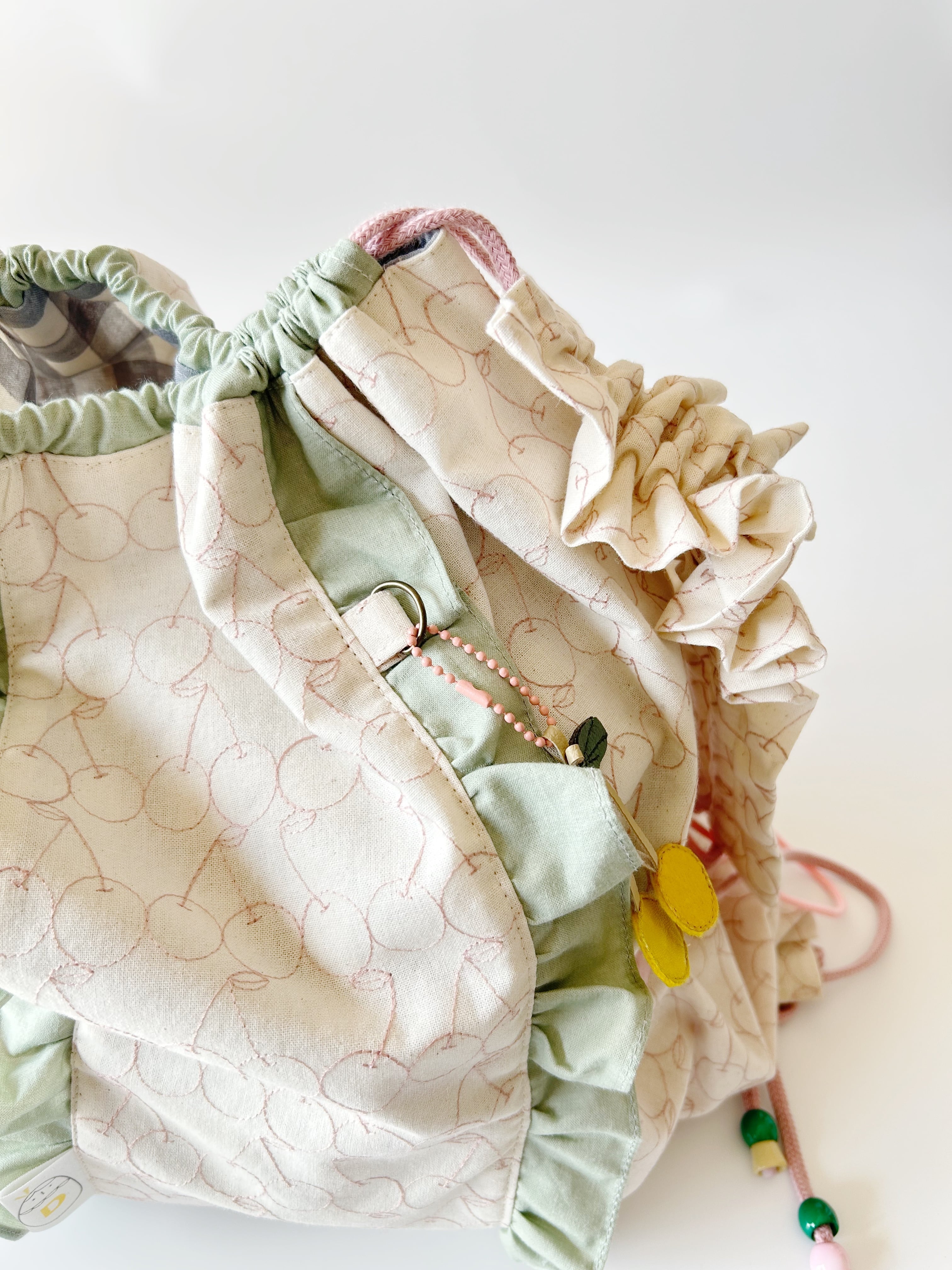 ショルダーストラップは、ギャザーをたくさんよせるとかわいさupです。