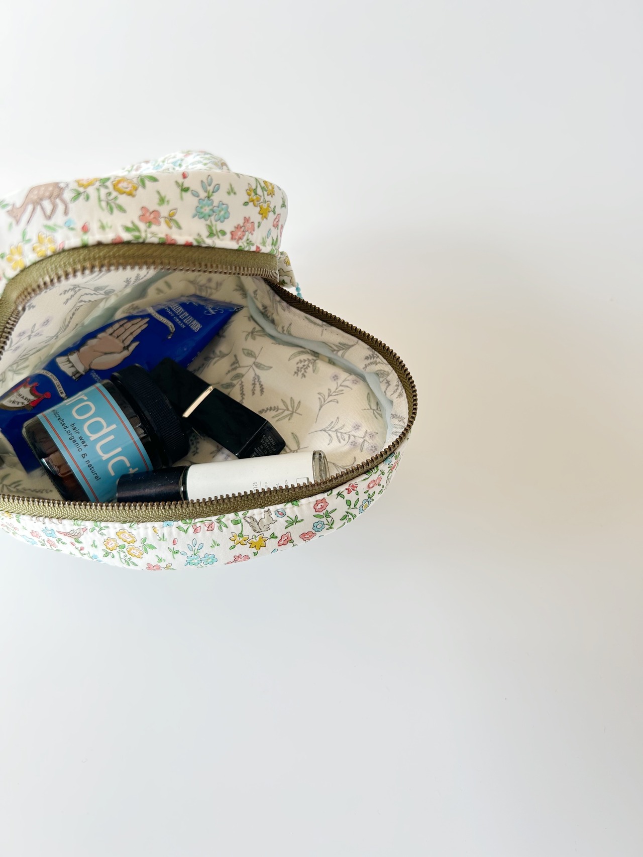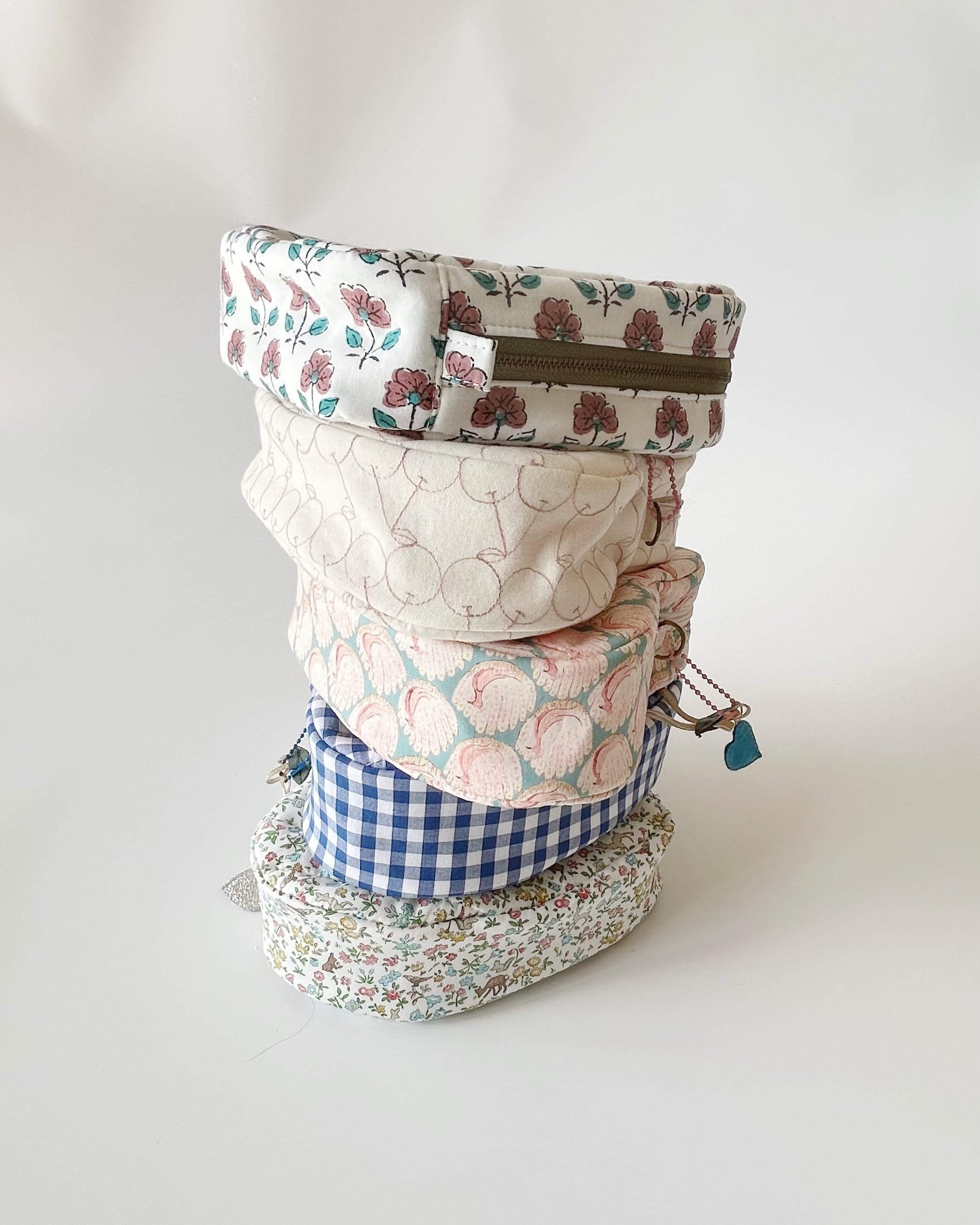 内側は、フジ色x生成り色の花柄で、水色バイアステープでくるんでます。