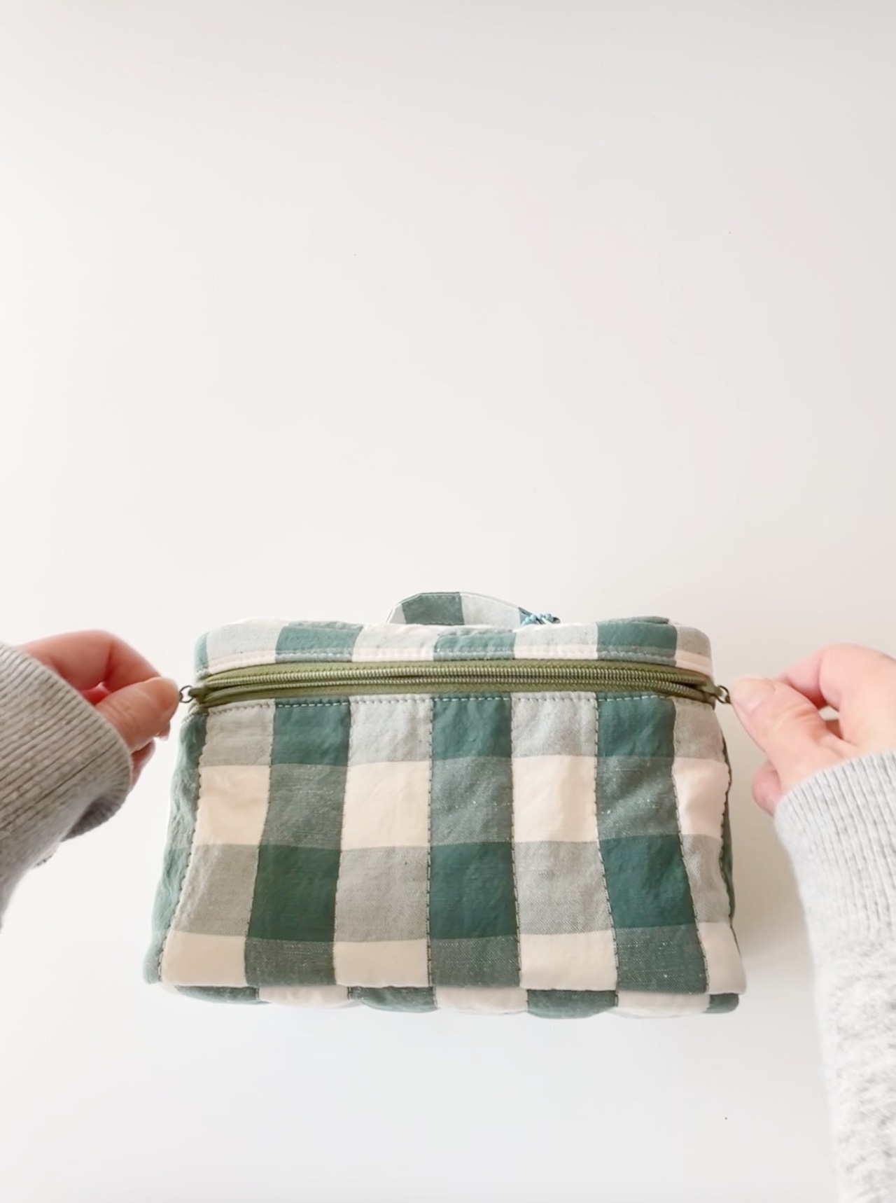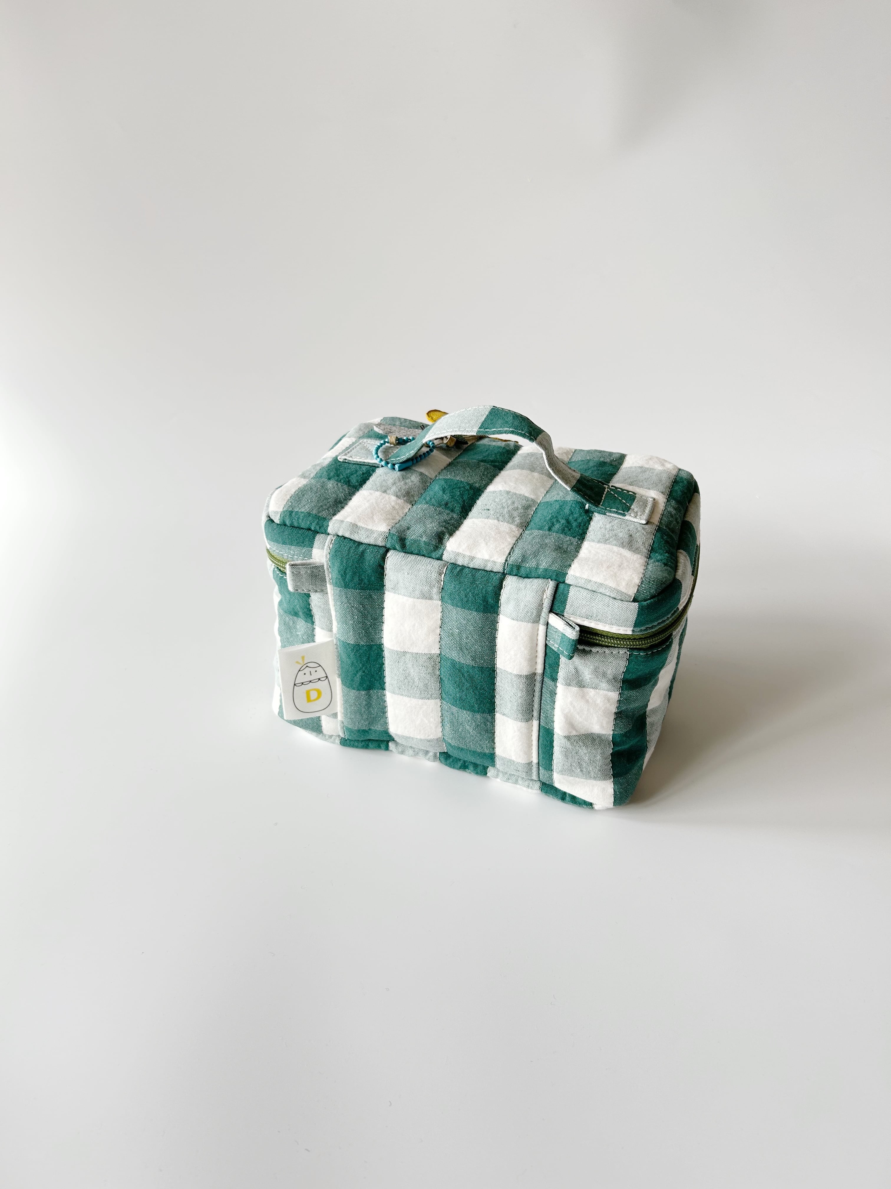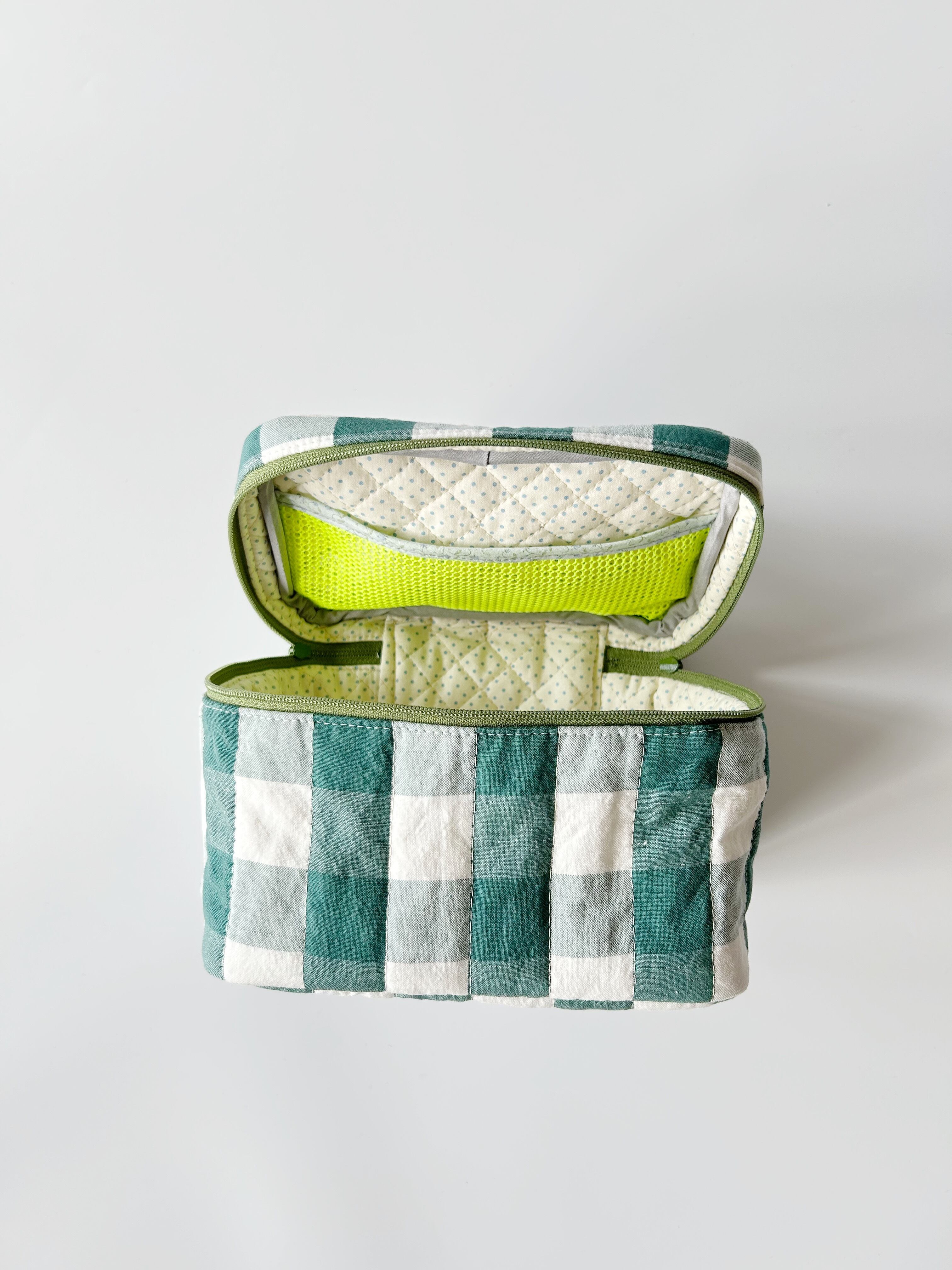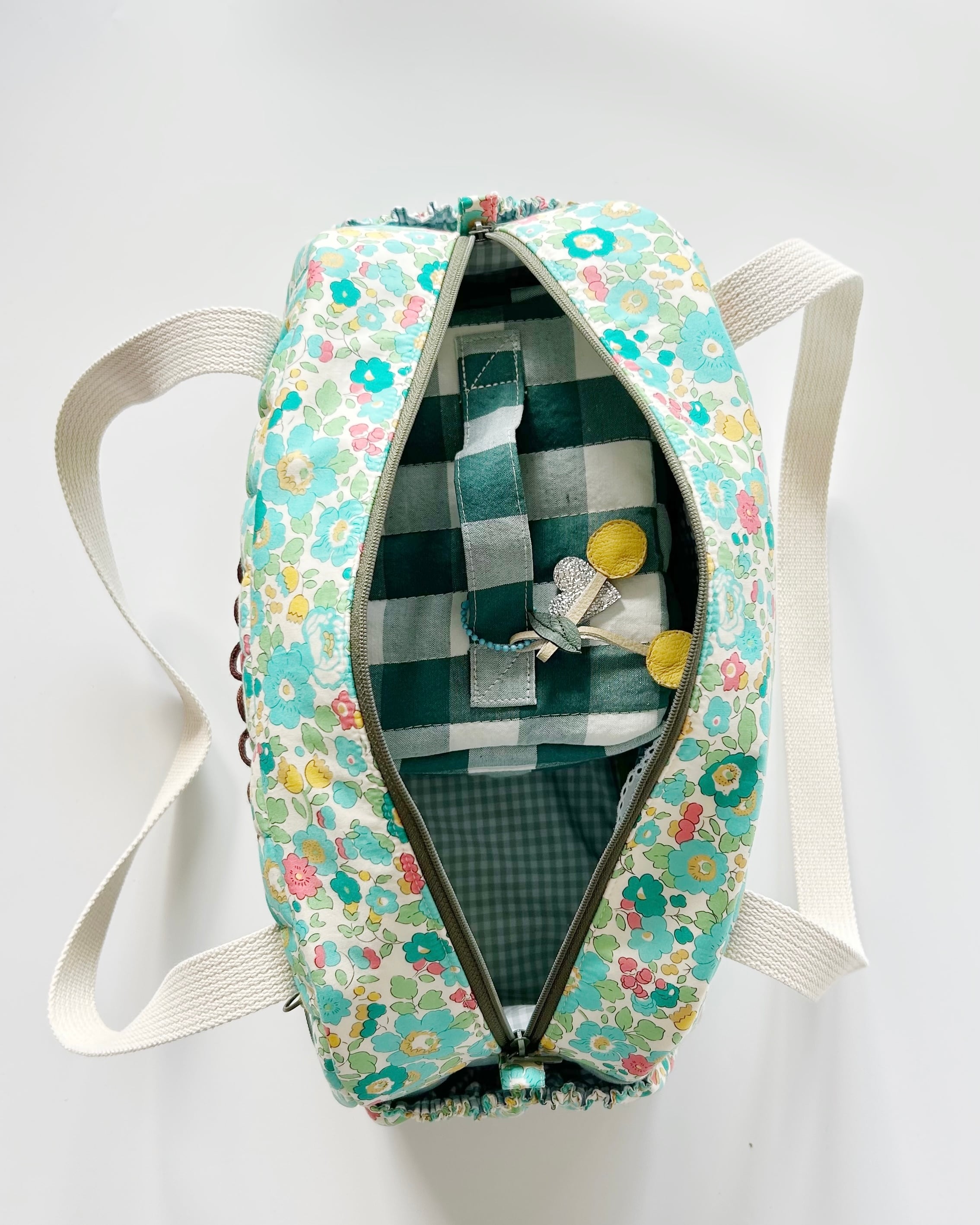 内側は、生成色に水色の水玉柄のキルティング生地です。