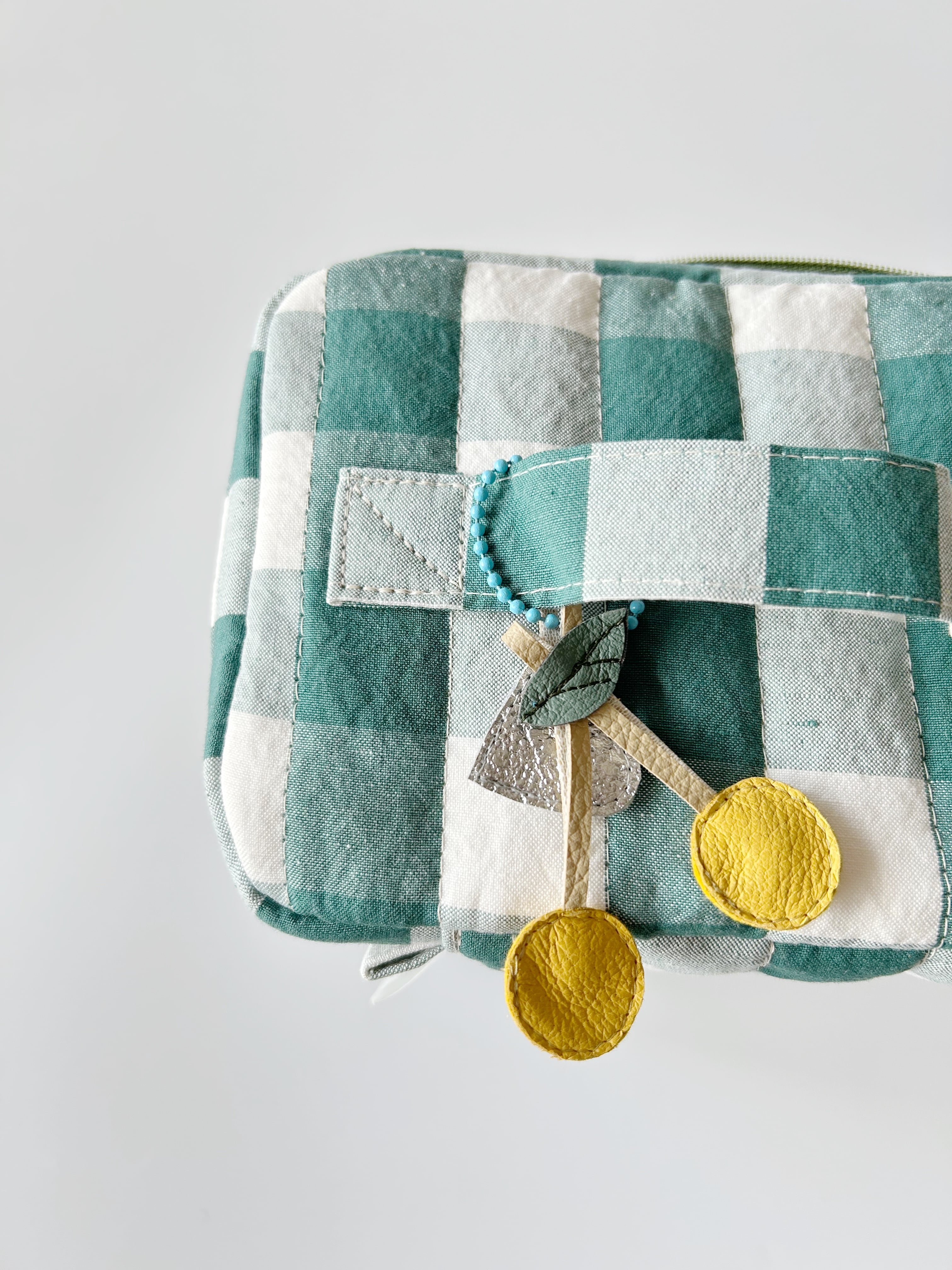 持ち手に、さくらんぼとハートのチャームが付いてます(ポールチェーンで取り外し可能)。