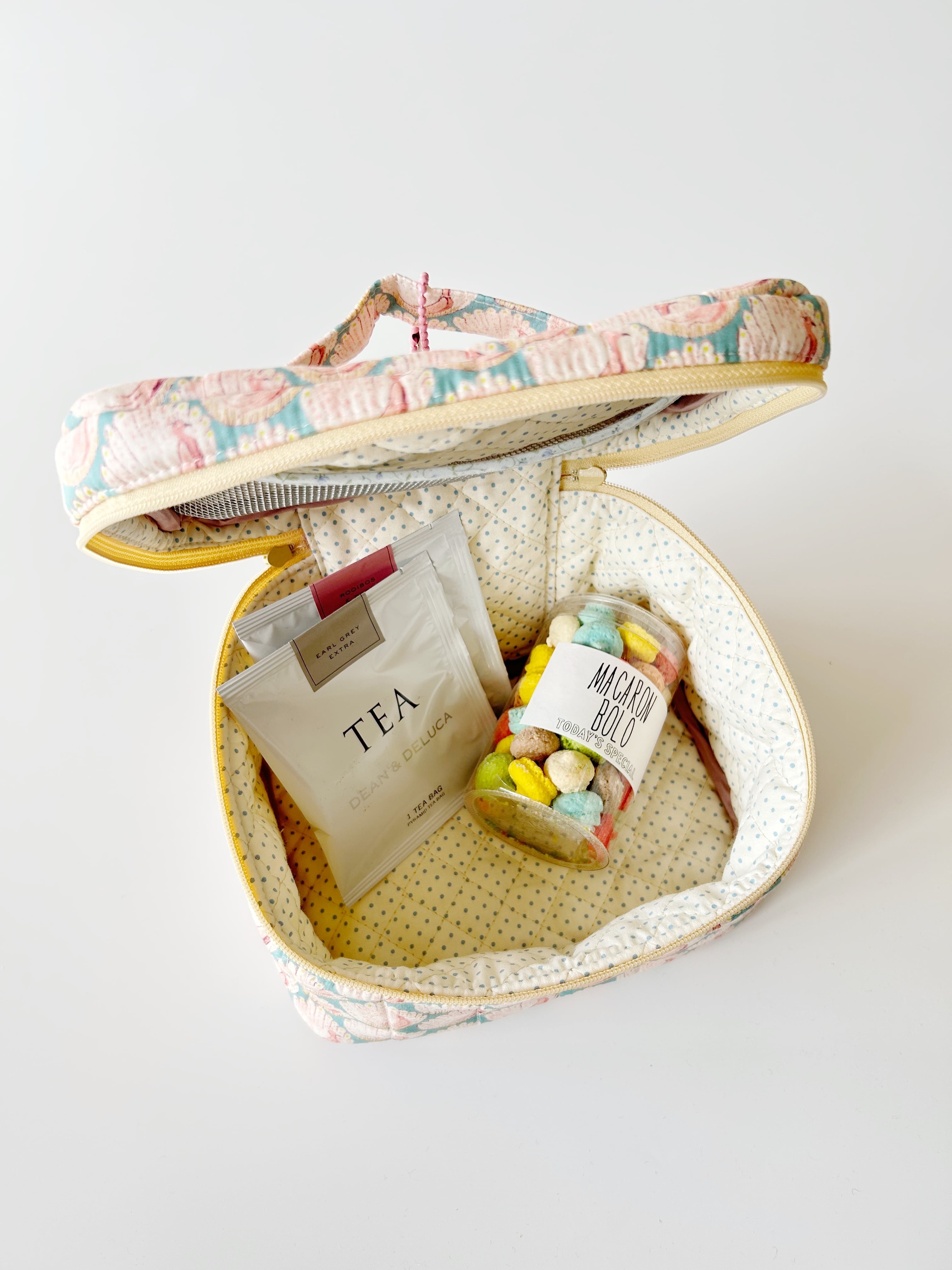内側は、生成色に水色の水玉柄のキルティング生地です。
