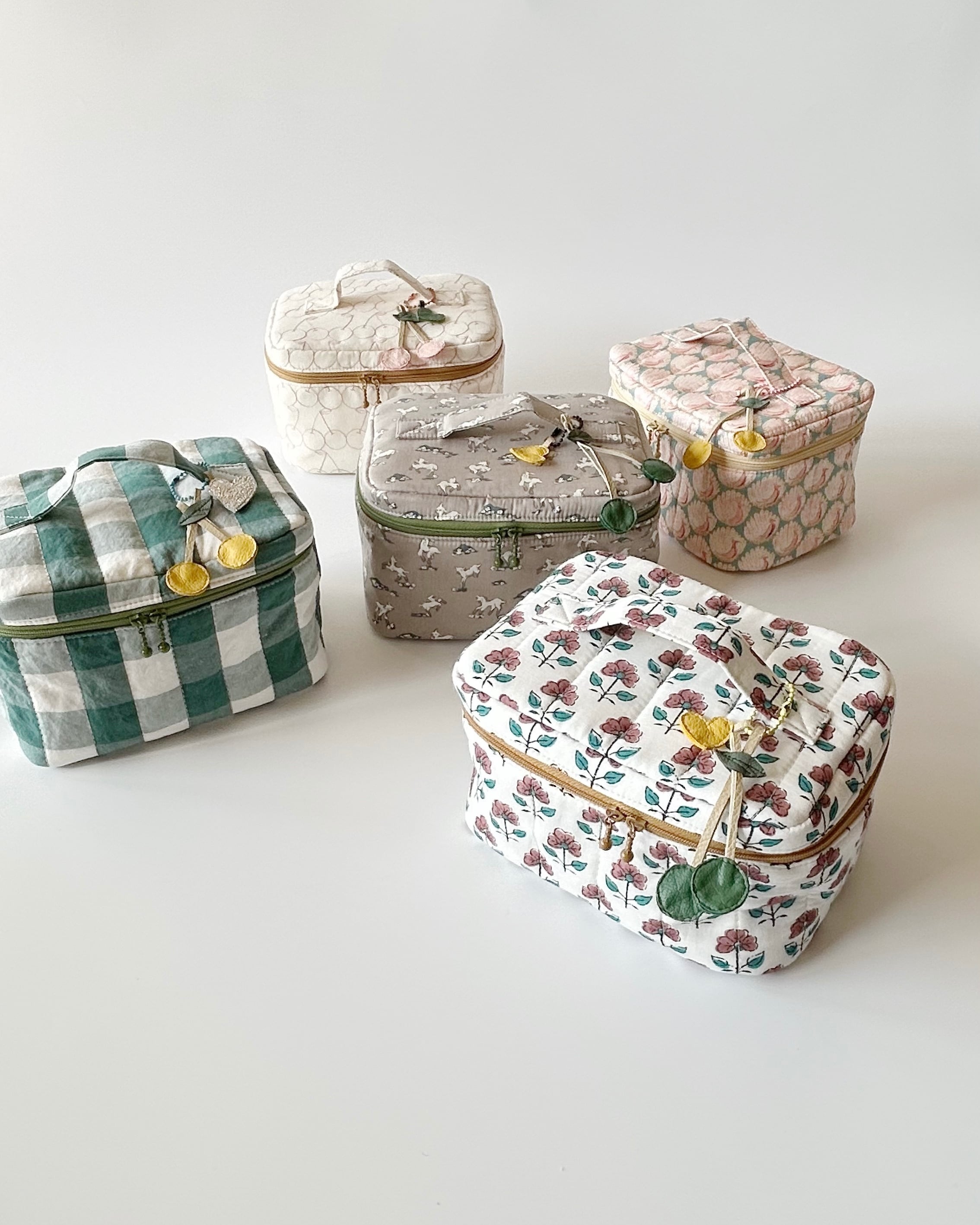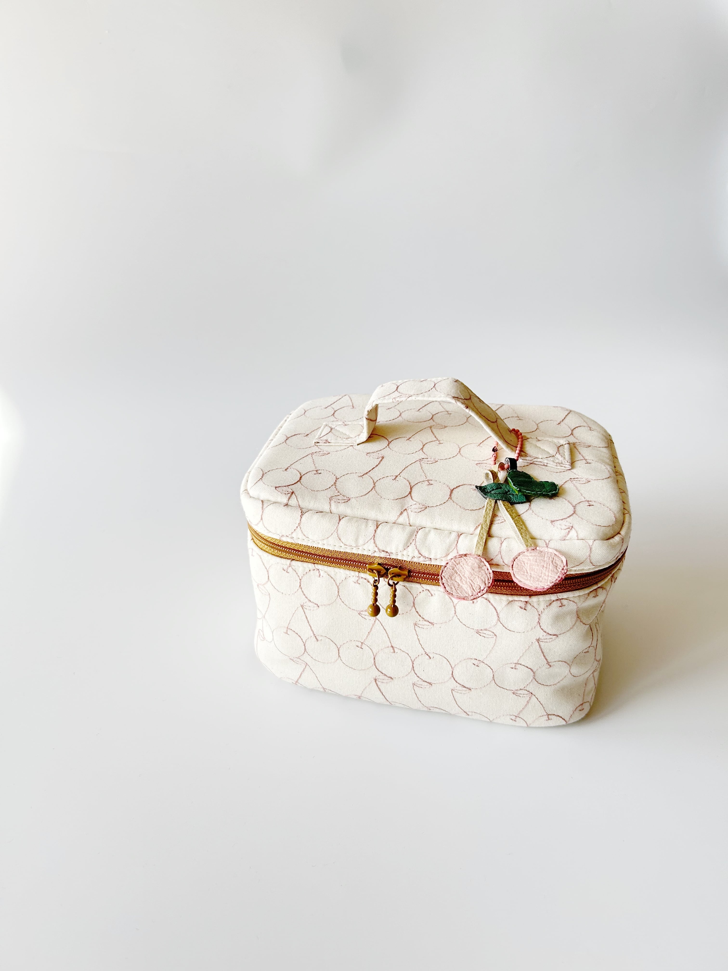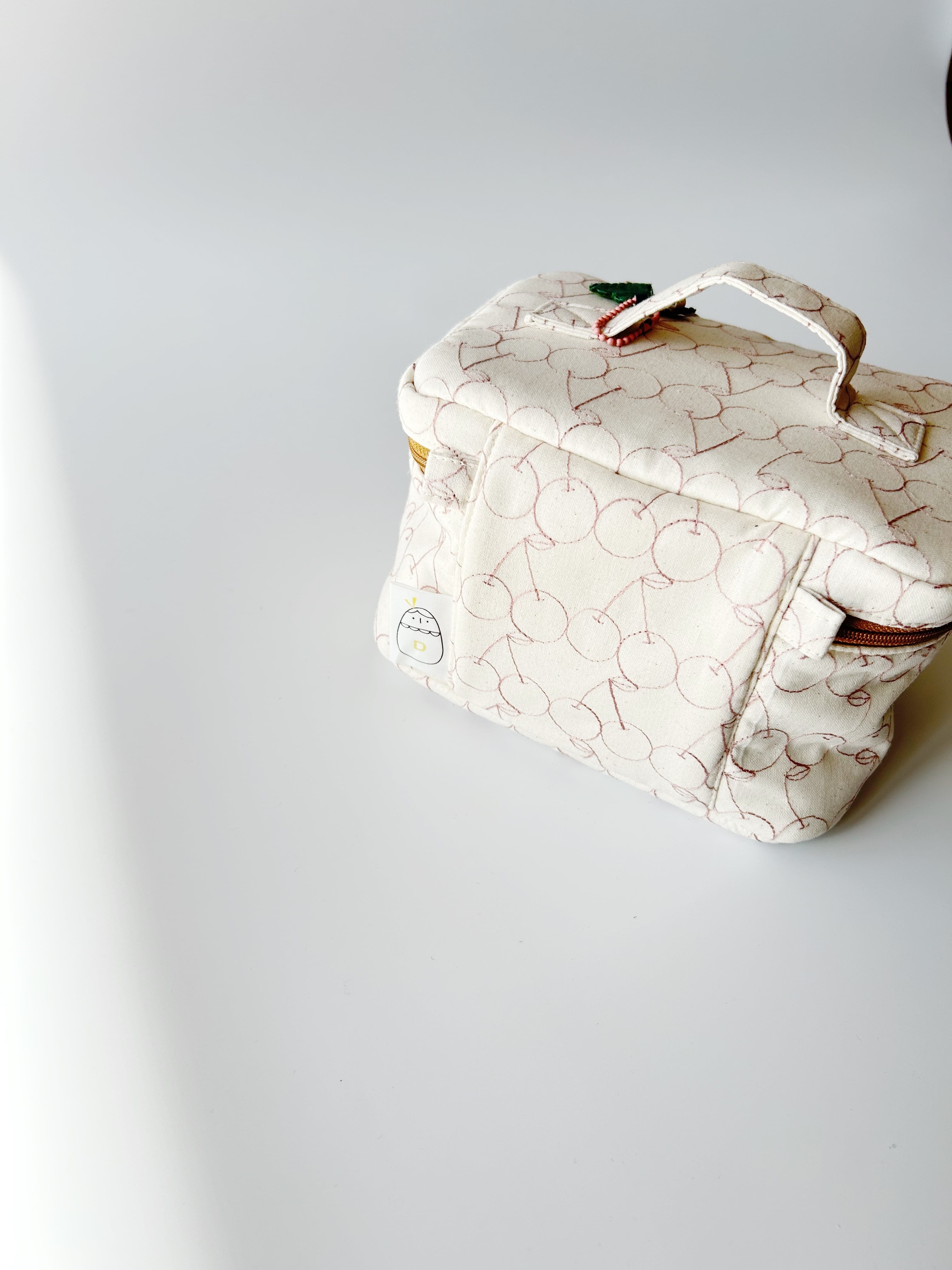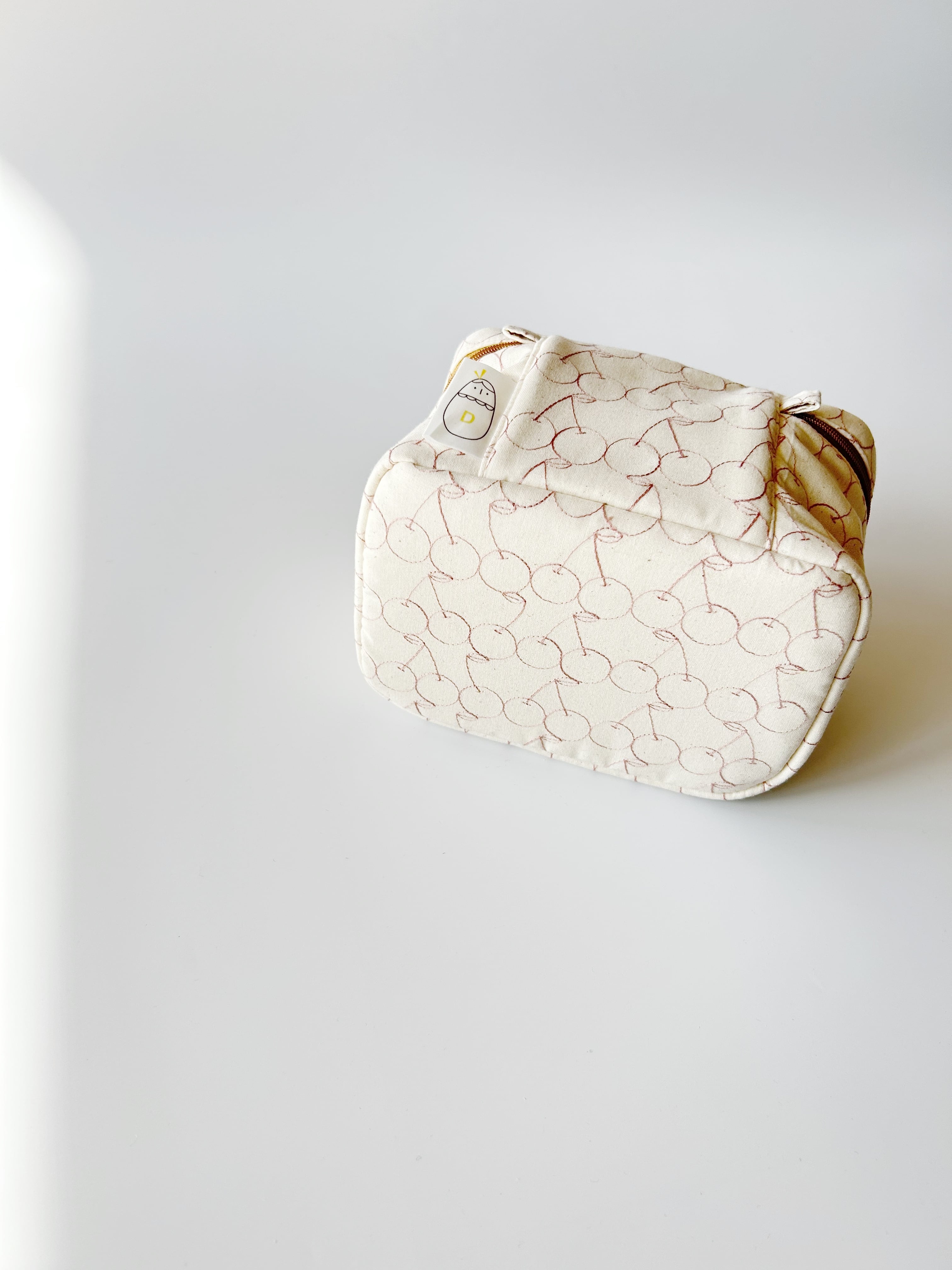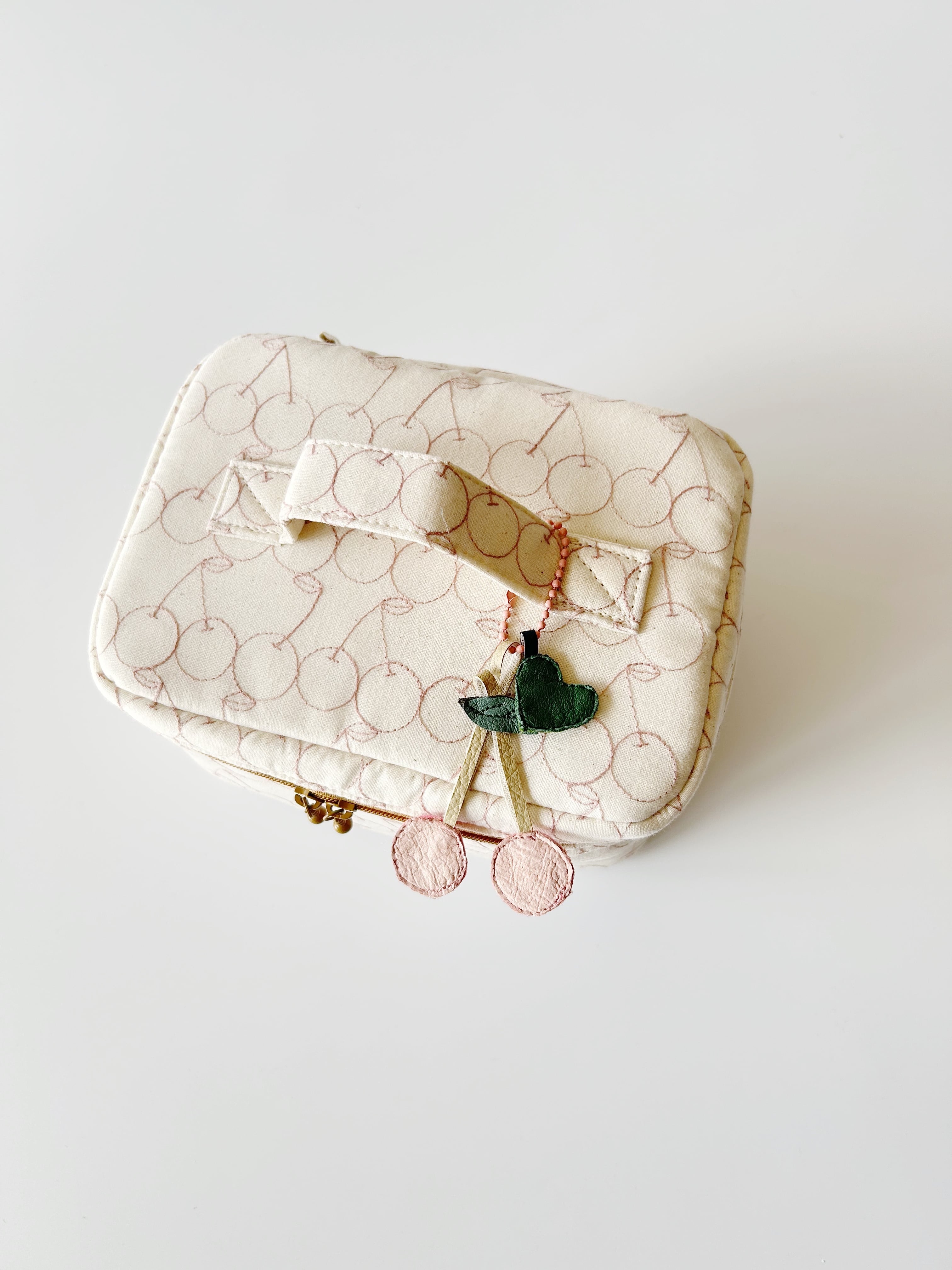 やさしいさくらんぼ柄が目を引くバニティポーチ