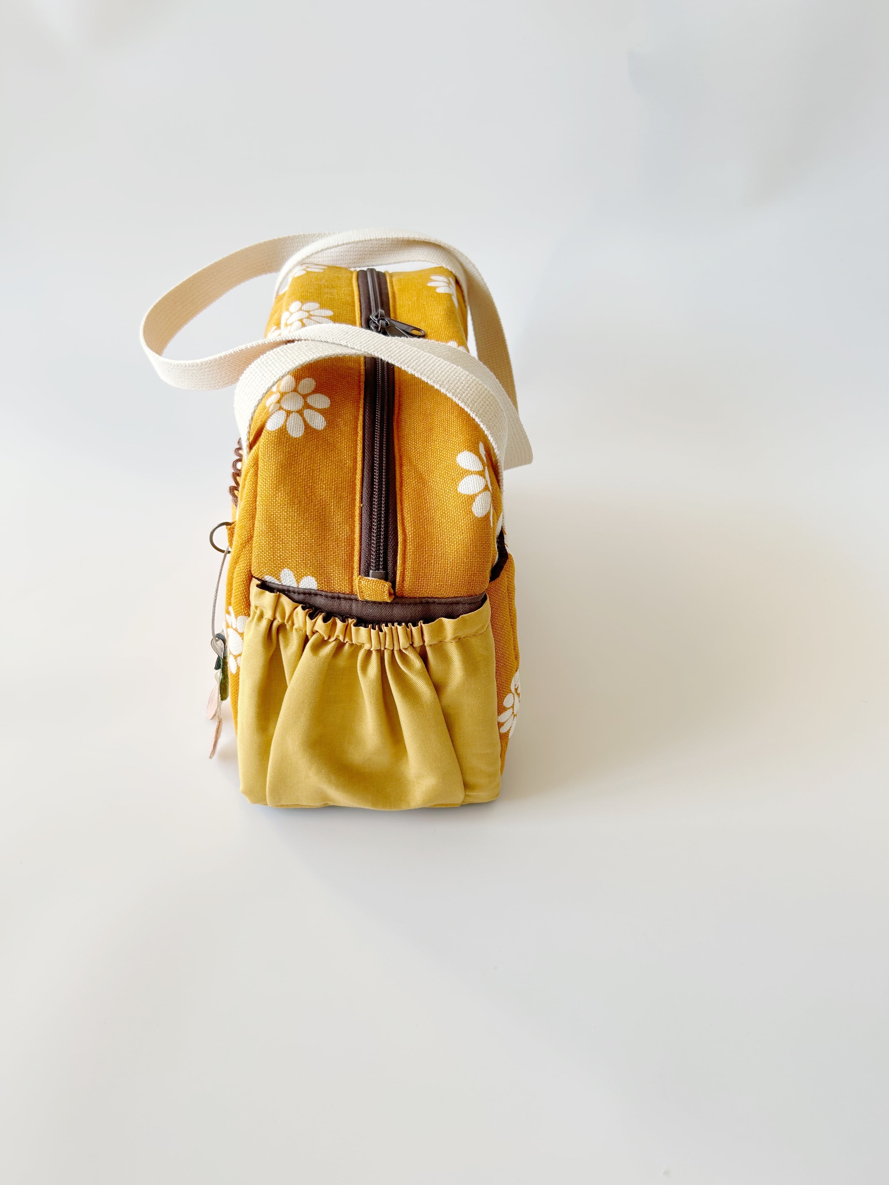マチは、サイドにかけて緩やかな台形になっていて横から見るとぽってりとした形になりキュートです。