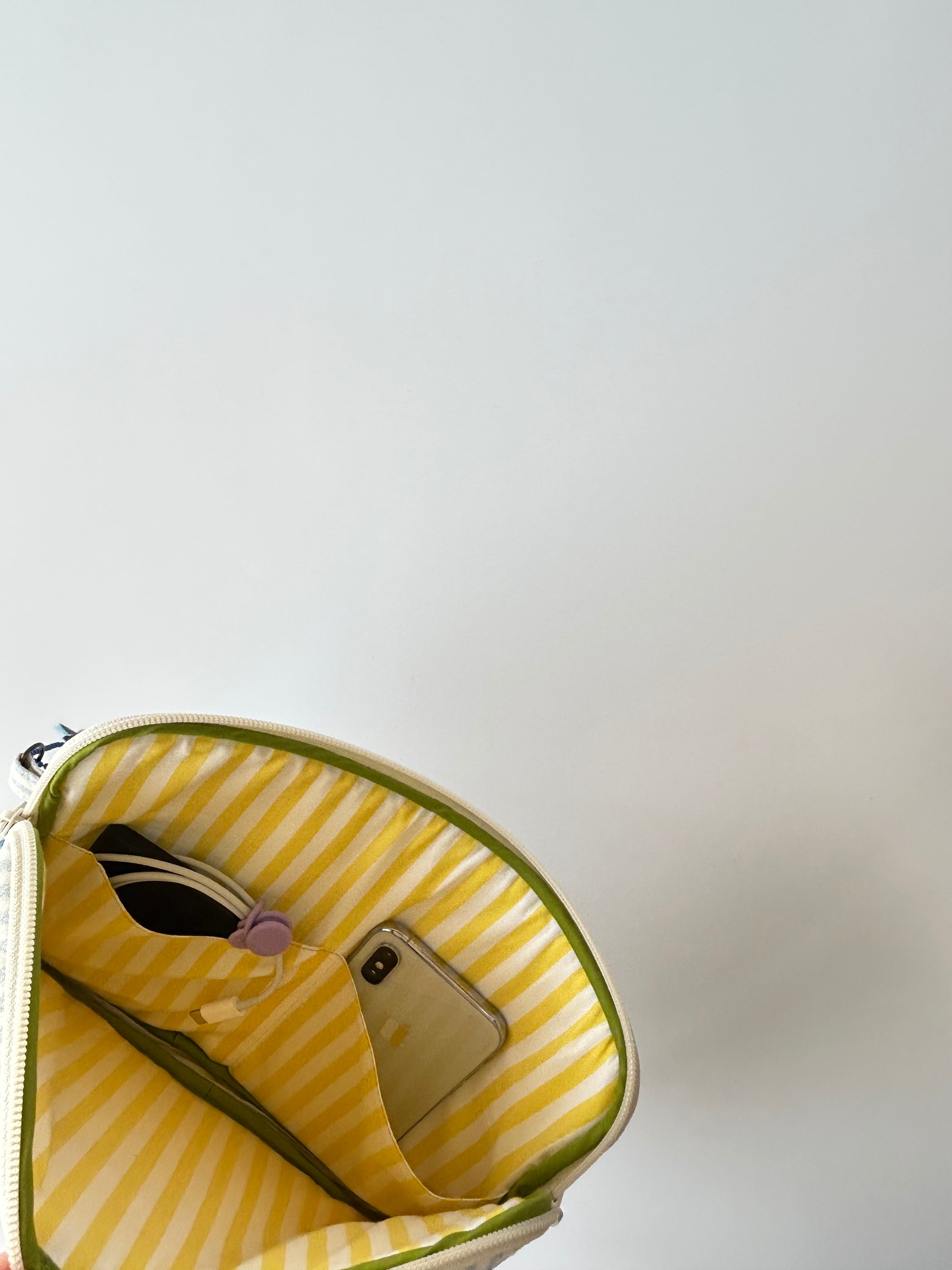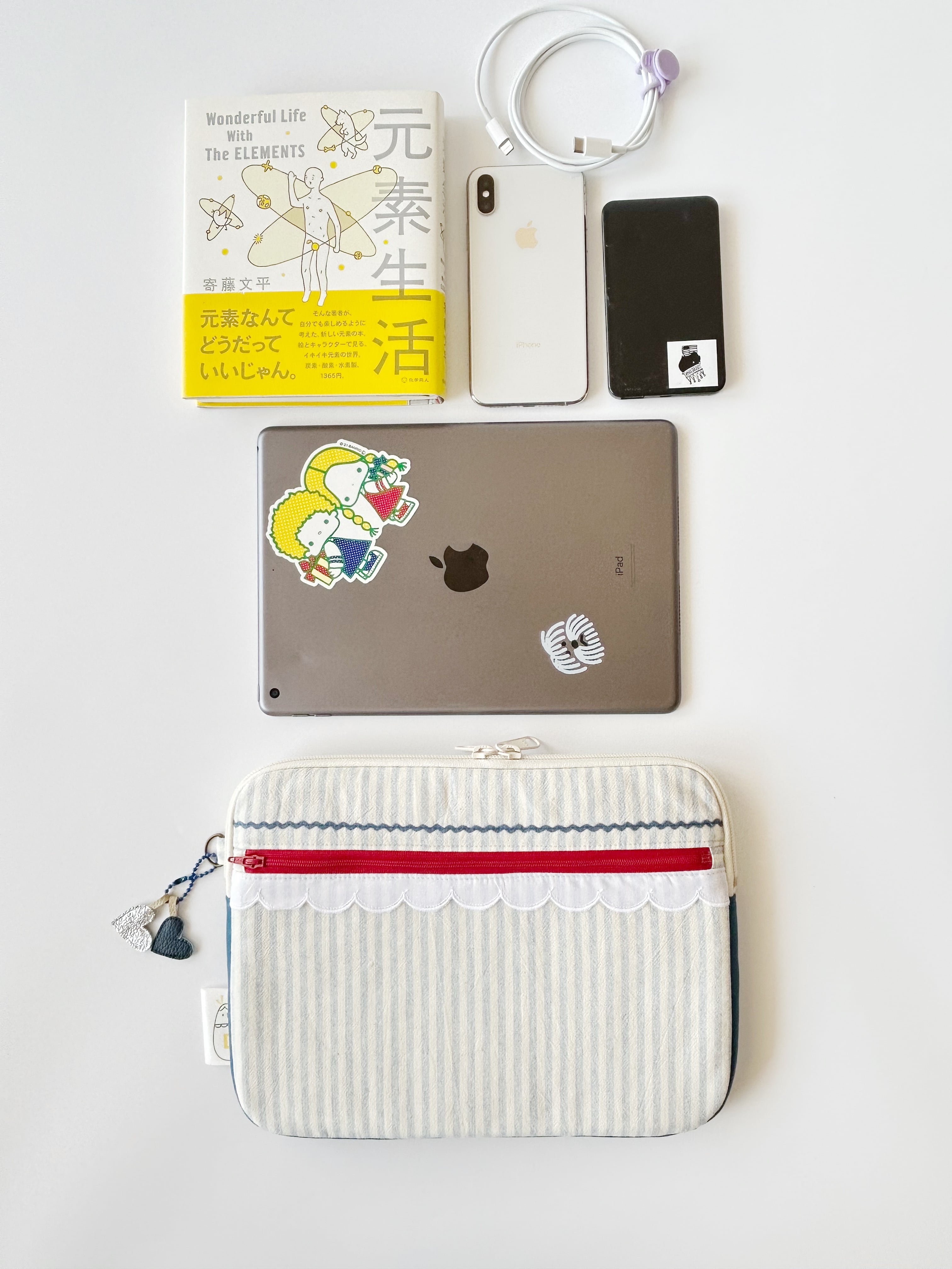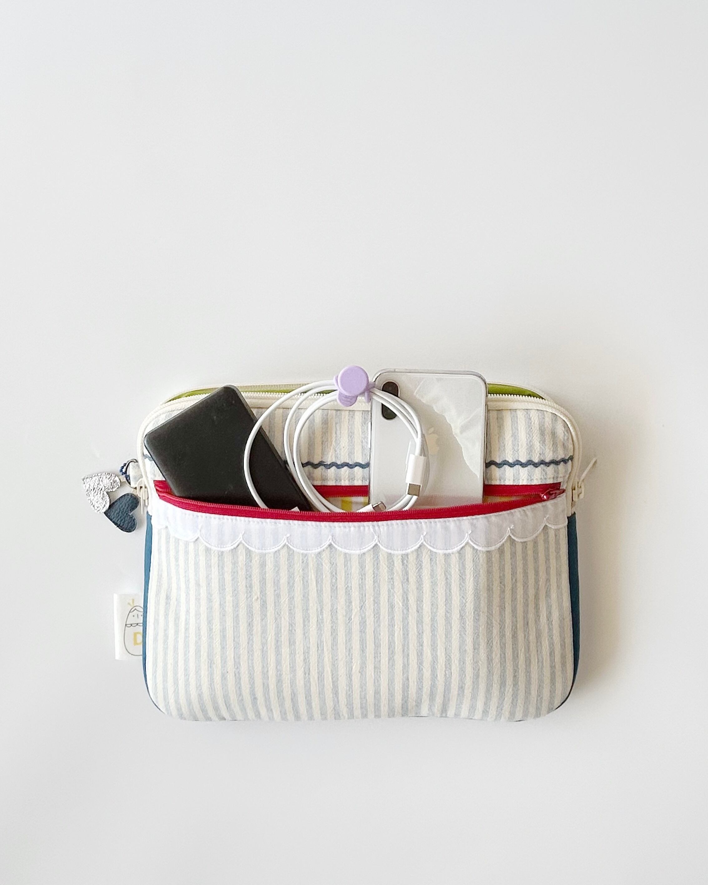 前側に大きなファスナーポケットが付いていて、充電器やコード、ワイヤレスイヤホンなど細々したものを入れるのに便利です。