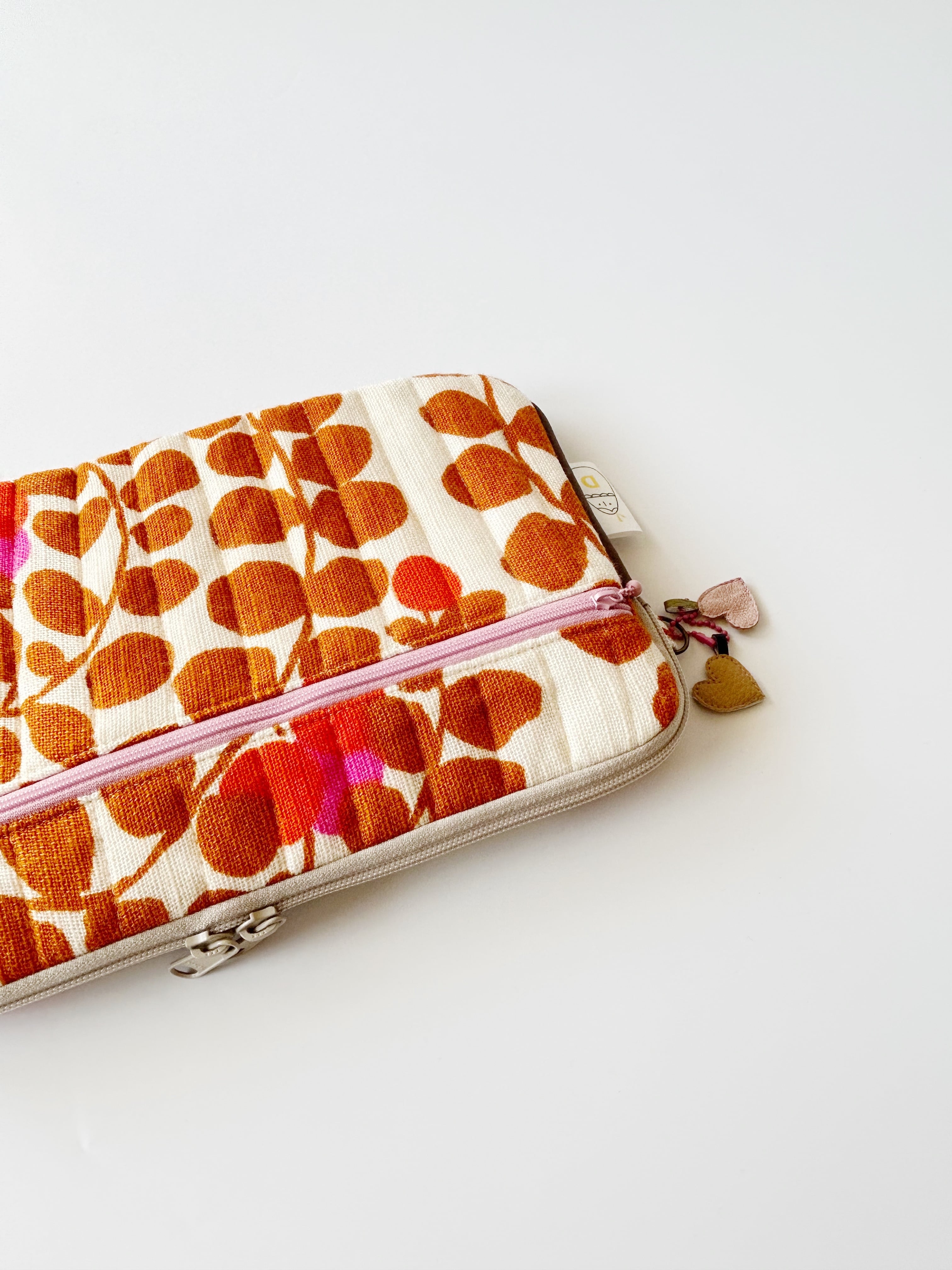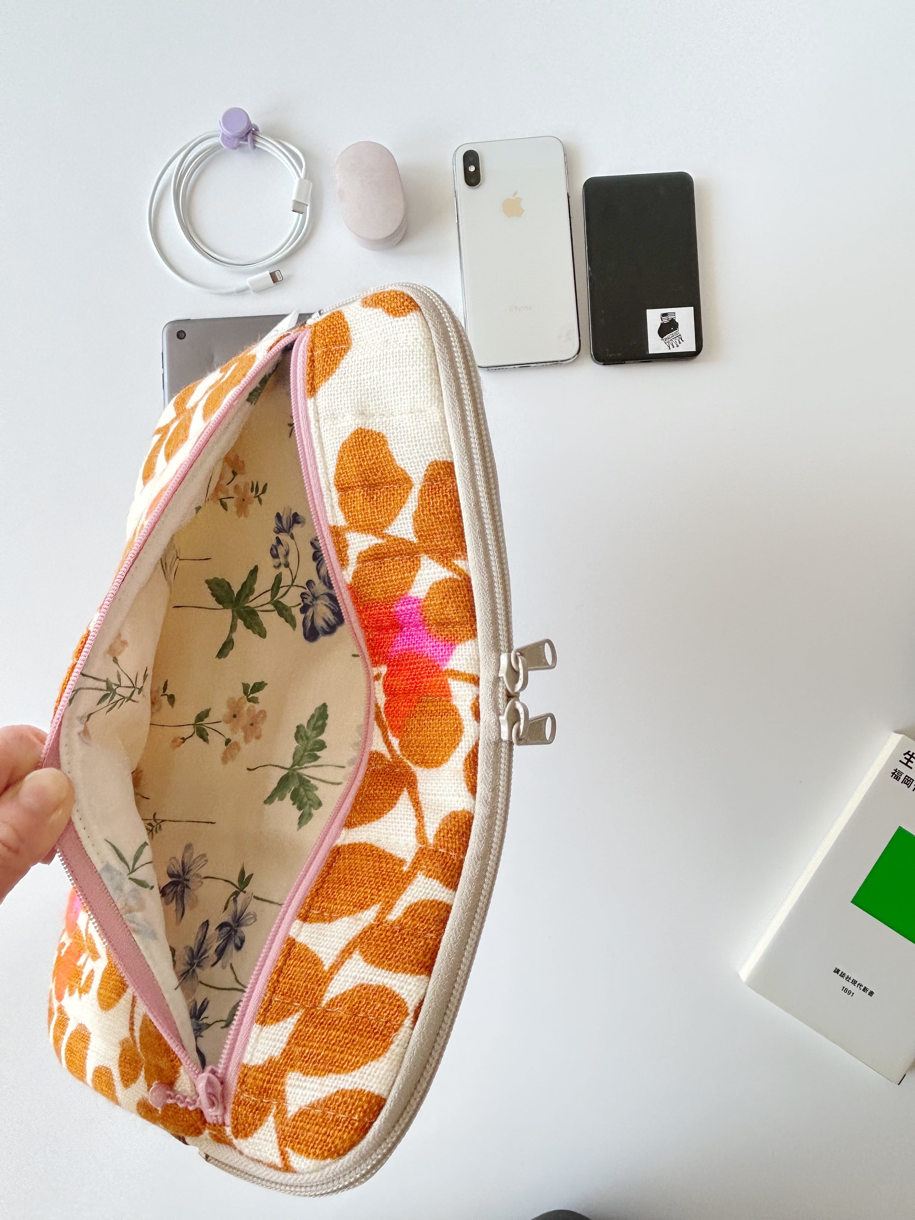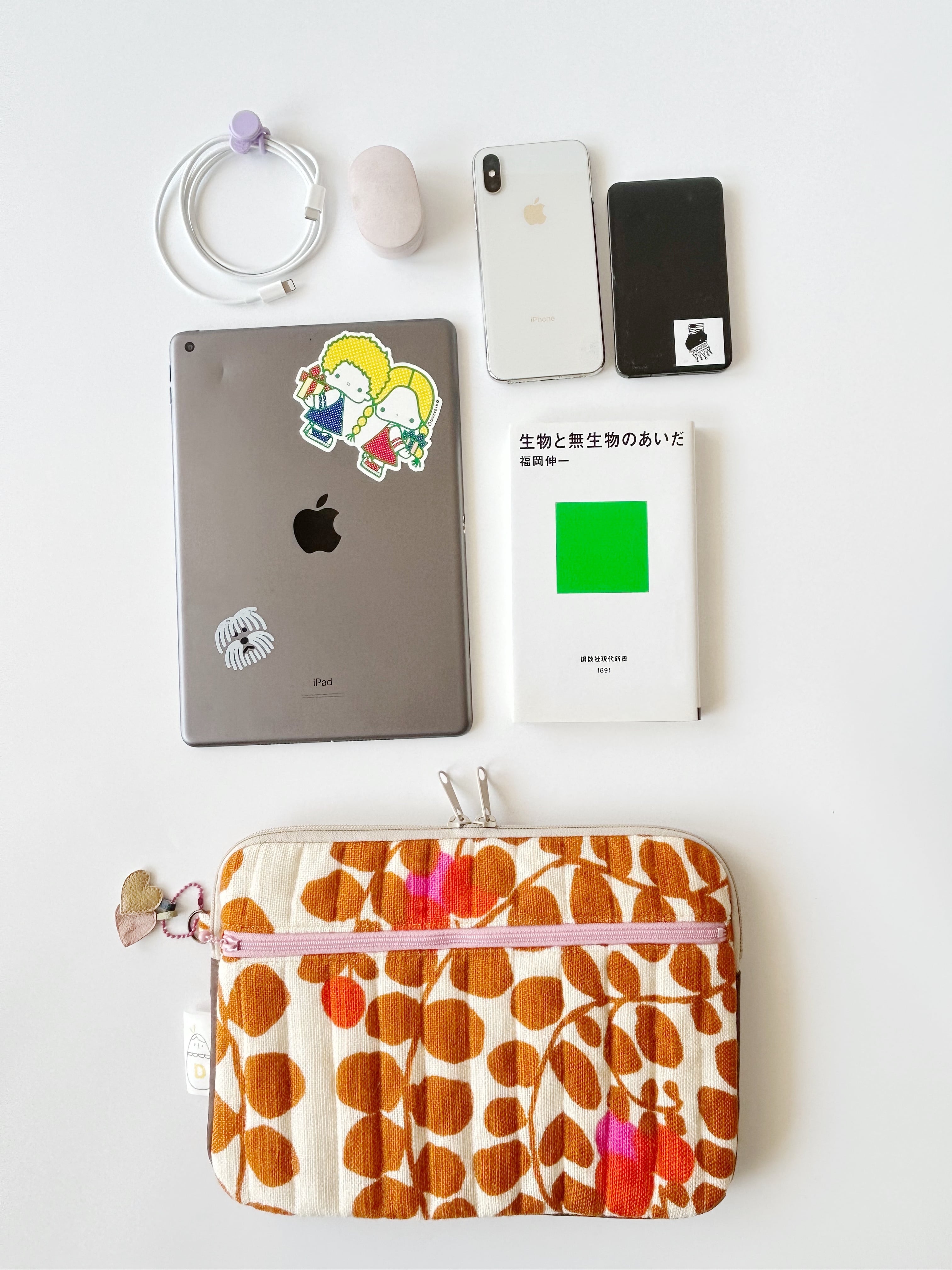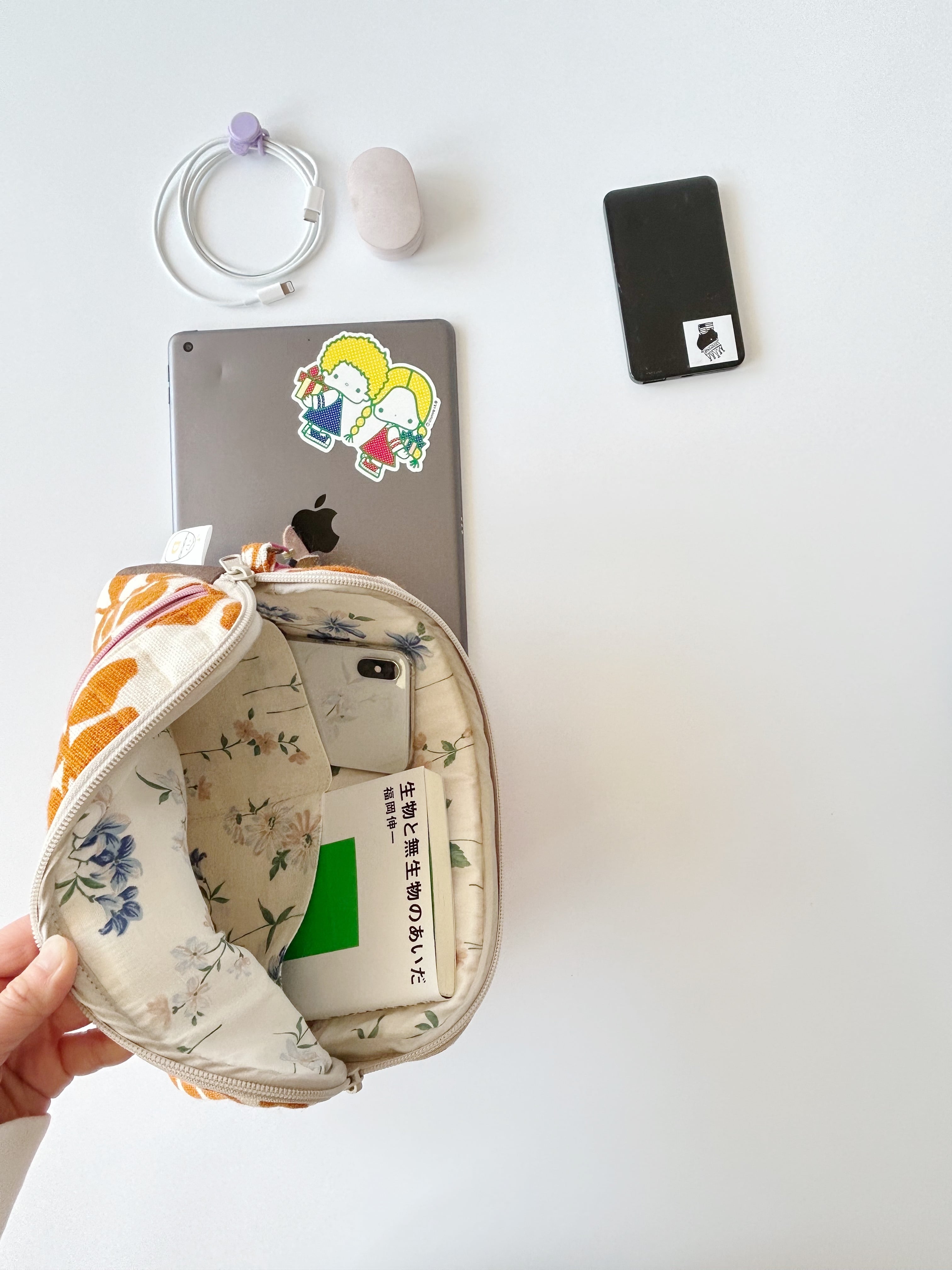 前側に大きなファスナーポケットが付いていて、充電器やコード、ワイヤレスイヤホンなど細々したものを入れるのに便利です。