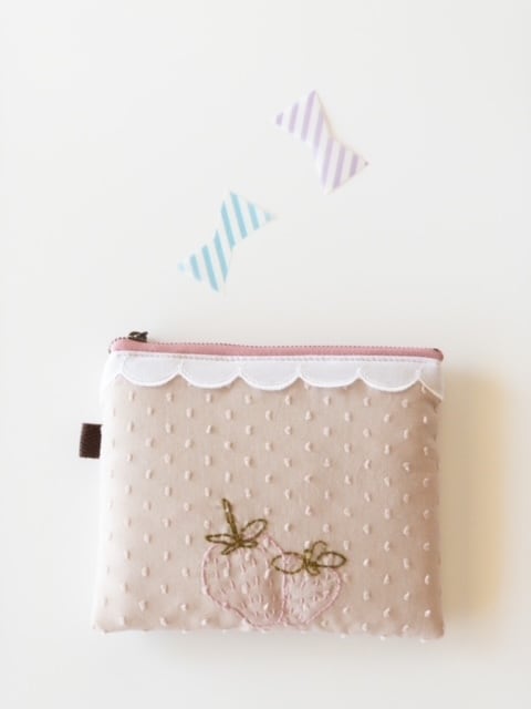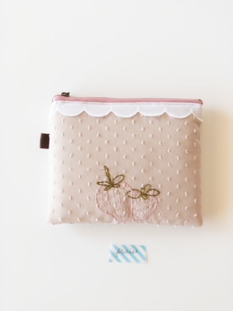 表面にいちごの刺繍をしていて、スカラップレースを上に付けています。