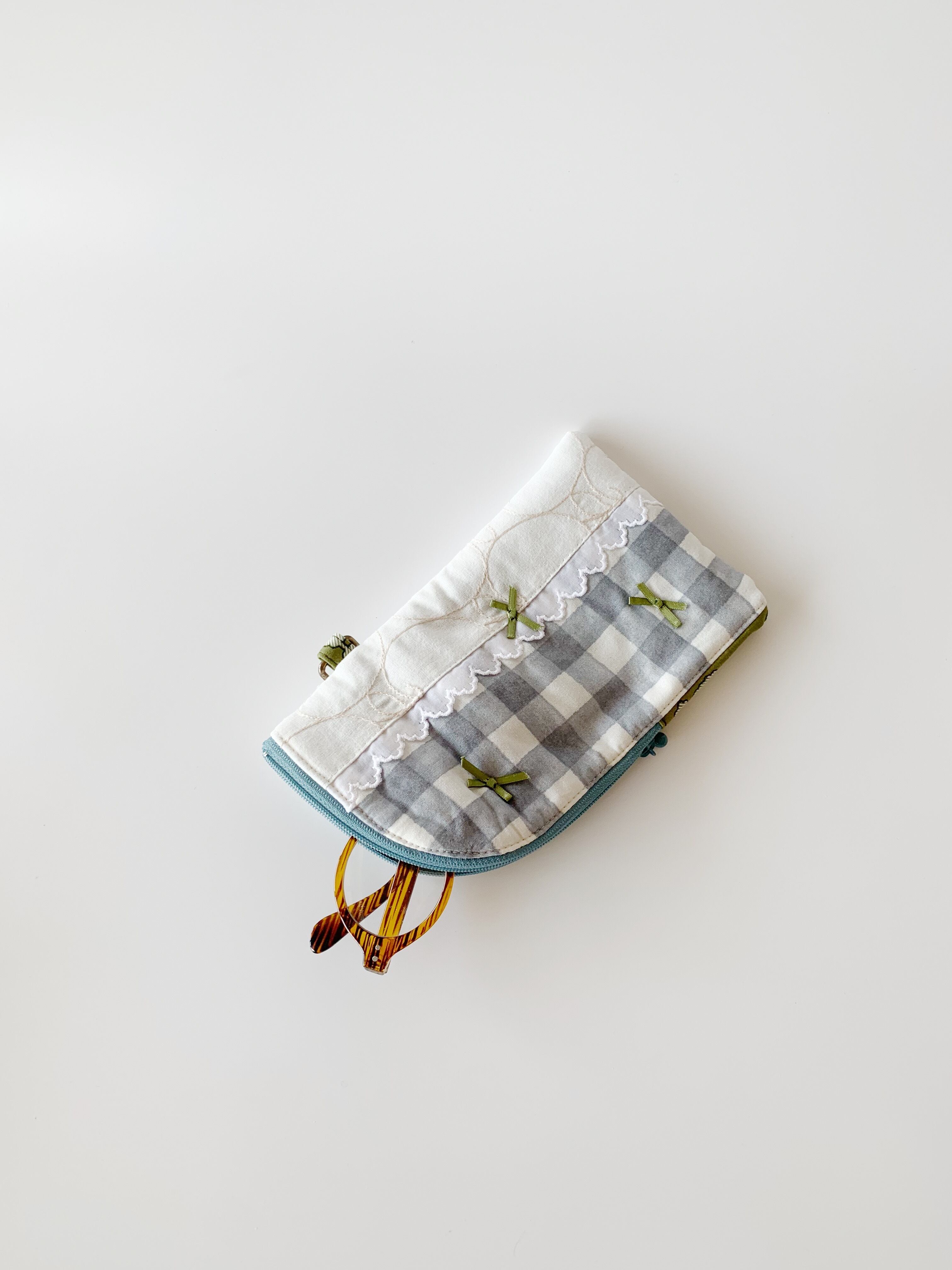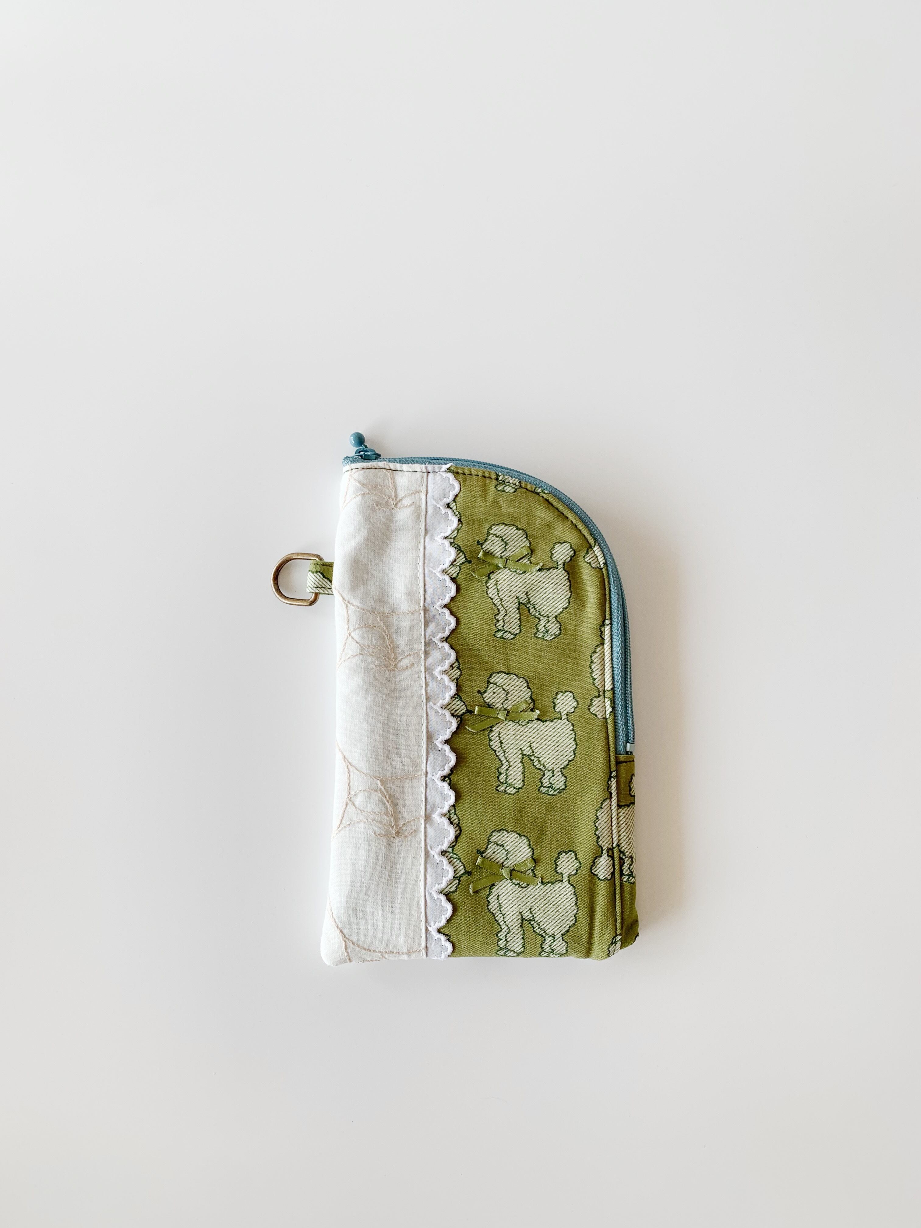 プードル柄とチェック柄とりんごの刺繍生地を組み合わせています。