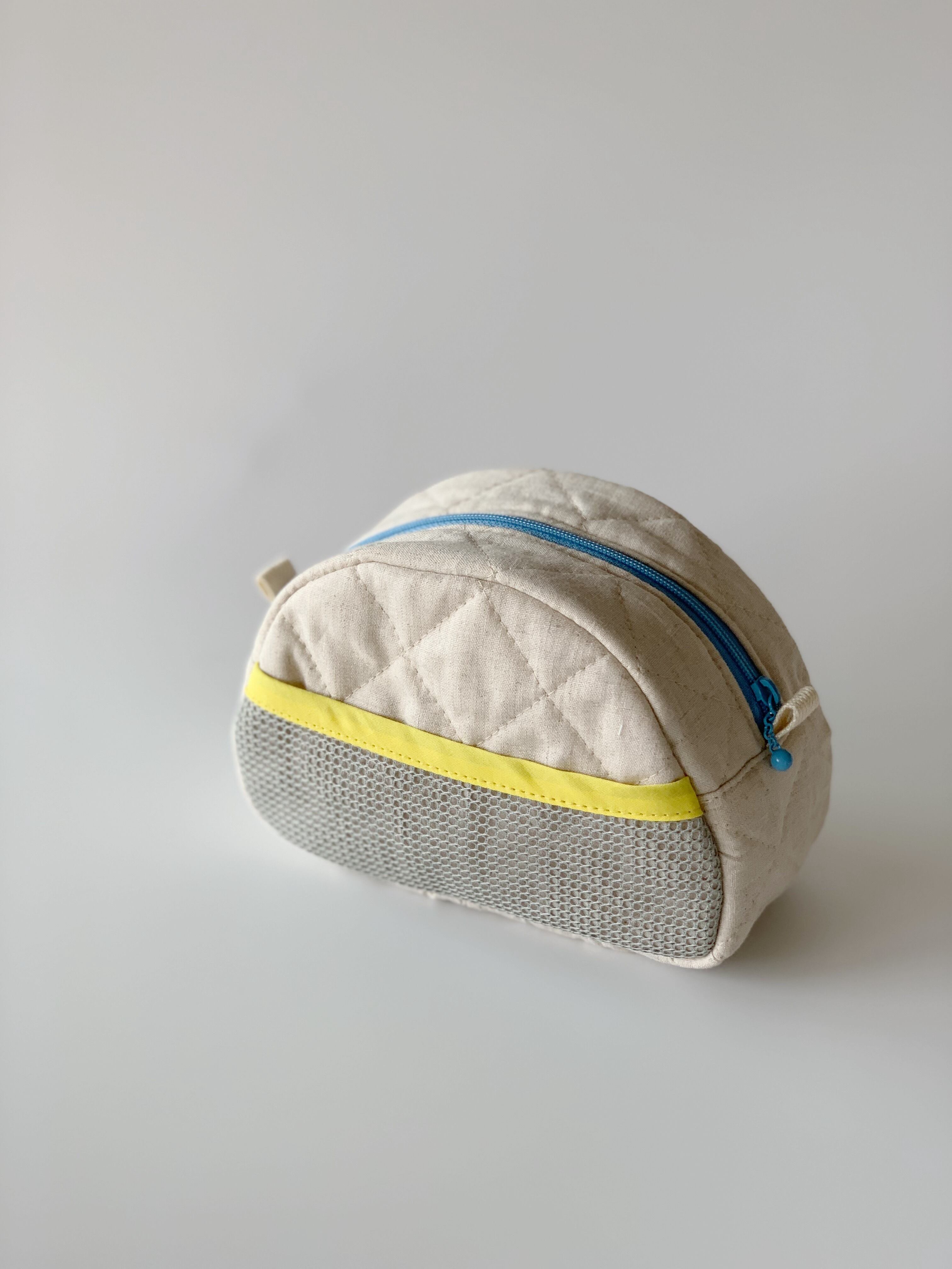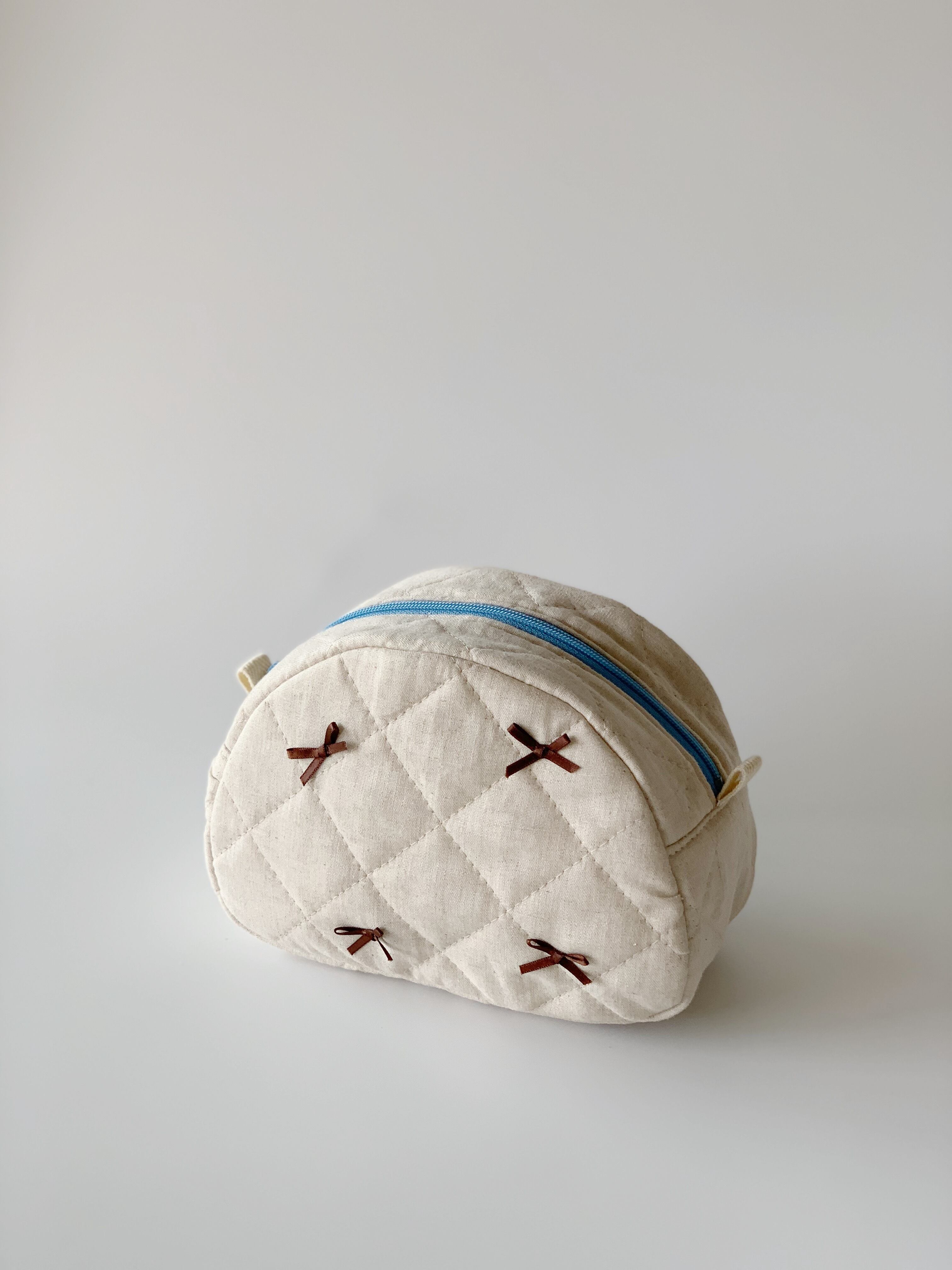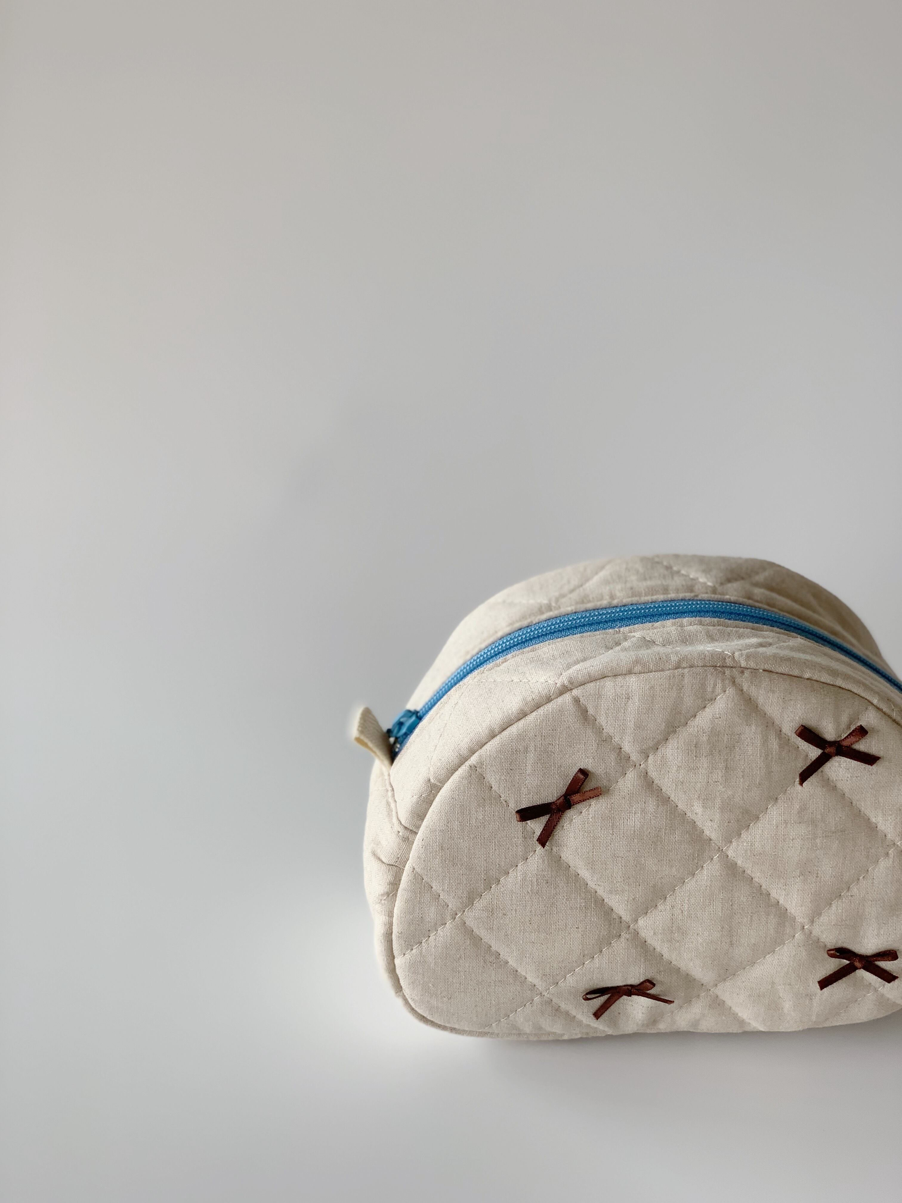 表は 生成色のキルティング生地です。前側はリボンが付いてて、反対側は透けるポケットが付いてます。